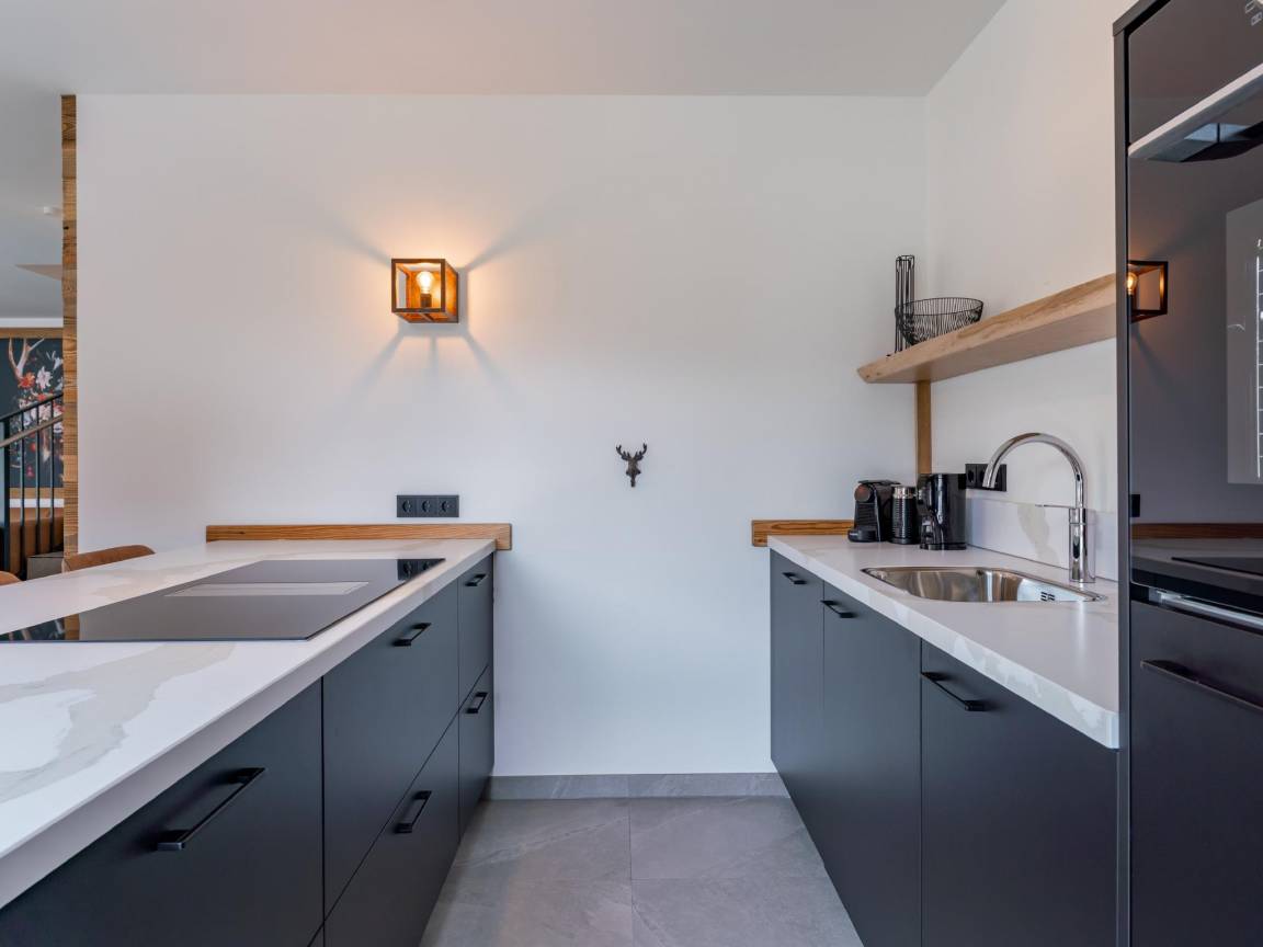 Layout : Parterre: 2x Wohnzimmer mit TV(digital, smart TV), Sitzecke , 2x Wohnküche mit Esstisch(6 Personen), Kochplatte(4 Kochplatten, Induktion), Kaffeemaschine(cups), Backofen, Geschirrspüler, Kühlschrank , 2x Toilette mit Waschbecken, Toilette , Flur, Abstellraum