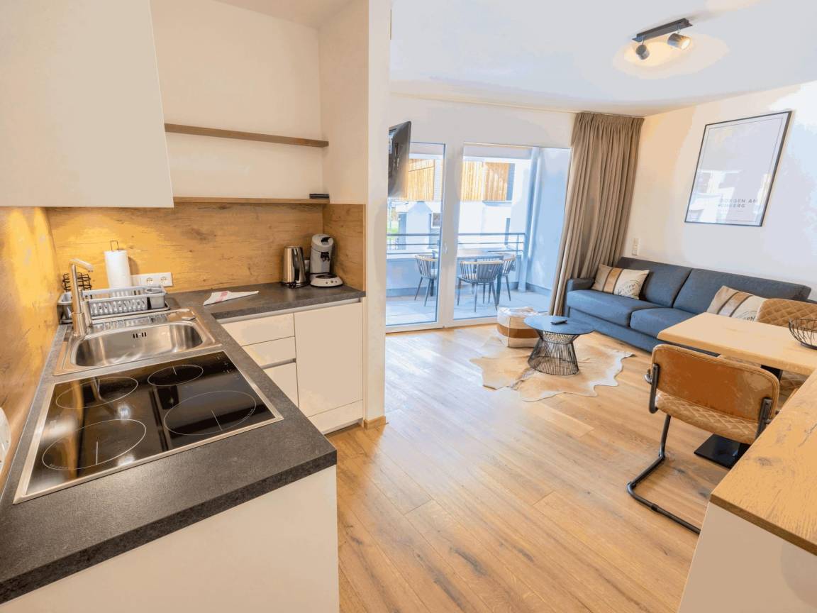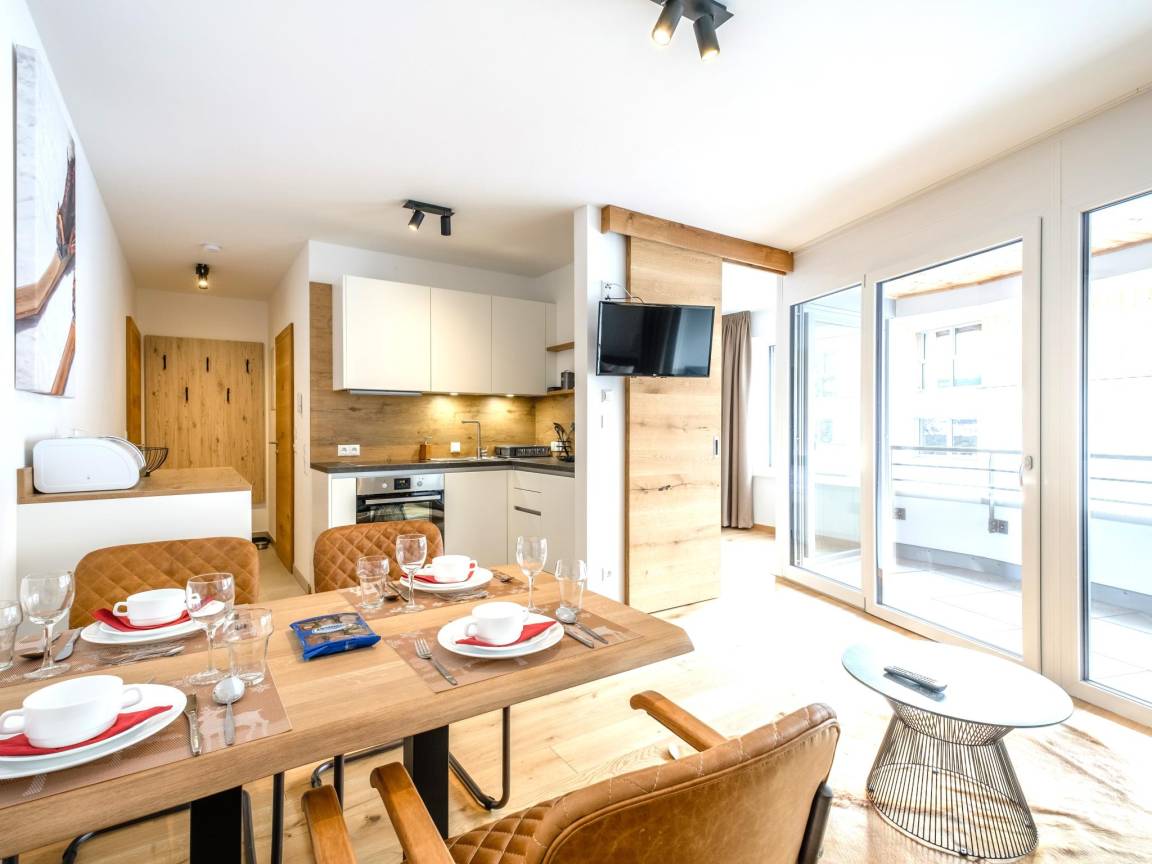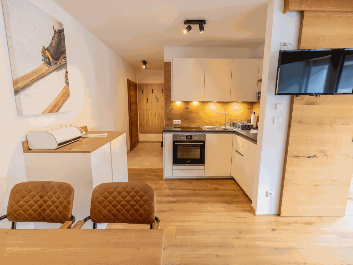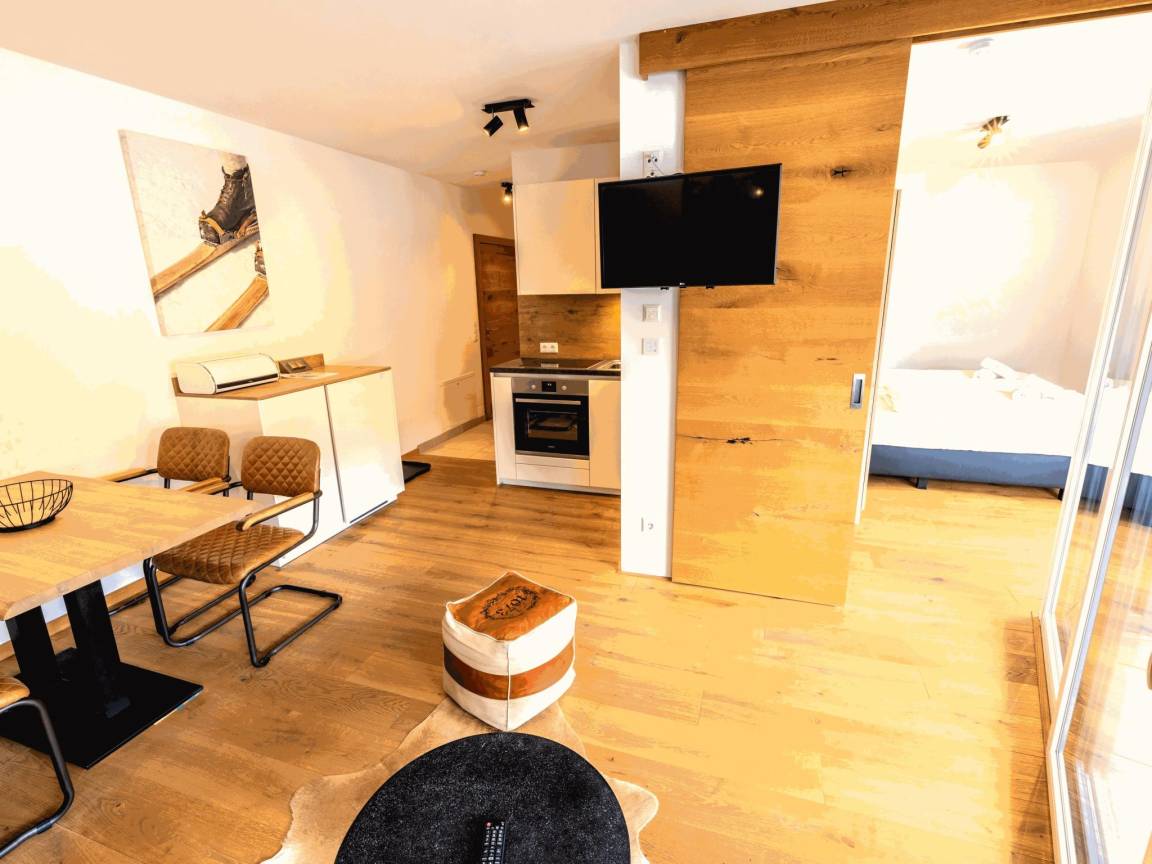 Hausbeschreibung : Diese Wohnung ist sonnig nach Süden ausgerichtet, modern und geschmackvoll eingerichtet und befindet sich im ersten Stock. Vom Schlafzimmer aus gelangst du auf den sehr geräumigen Balkon (7m²) mit automatischen Markisen. Ideal für den Sommer! In der vollständig modern ausgestatteten offenen Küche, dem gemütlichen Ess- und Wohnzimmer wirst du dich schnell wie zu Hause fühlen. Es gibt einen gemeinsamen Abstellraum für Skier mit Skischuhtrocknern. Auch Fahrräder können hier abgestellt werden