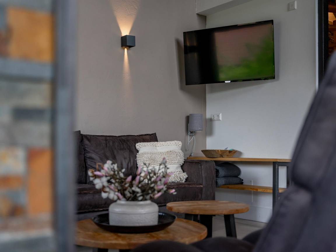Layout : Parterre: Wohnzimmer mit Doppelschlafcouch(Empore), TV(Empore), TV, Kamin, Sitzecke(Empore), Sitzecke , Küche mit Esstisch, Kochplatte, Dunstabzugshaube, Kaffeemaschine, Backofen, Mikrowelle, Geschirrspüler, Kühl-/Gefrierkombination , Schlafzimmer mit Doppelbett, TV , Badezimmer mit Dusche, Waschbecken , Toilette mit Waschbecken, Toilette , Terrasse