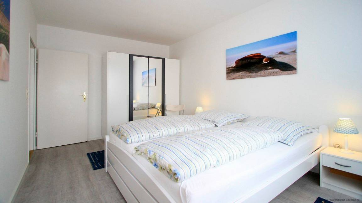 Insgesamt stehen Ihnen drei separate Schlafzimmer zur Verfügung. Unsere Betten sind hochwertig und machen so guten Schlafkomfort möglich. In den Kleiderschränken findet sich ausreichend Platz für Ihre Kleidung und sonstiges Gepäck. Zwei der Schlafzimmer sind mit je einem Doppelbett eingerichtet. Das dritte Schlafzimmer verfügt über zwei Einzelbetten.