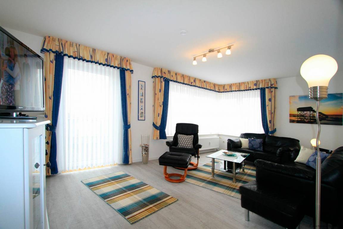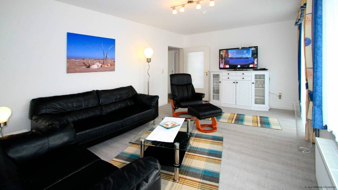 Das helle Wohnzimmer mit lederner Sitzgarnitur und TV-Gerät lädt zum abendlichen klönen ein. Die schönen Vorhänge und Leuchten machen den Raum sehr wohnlich.