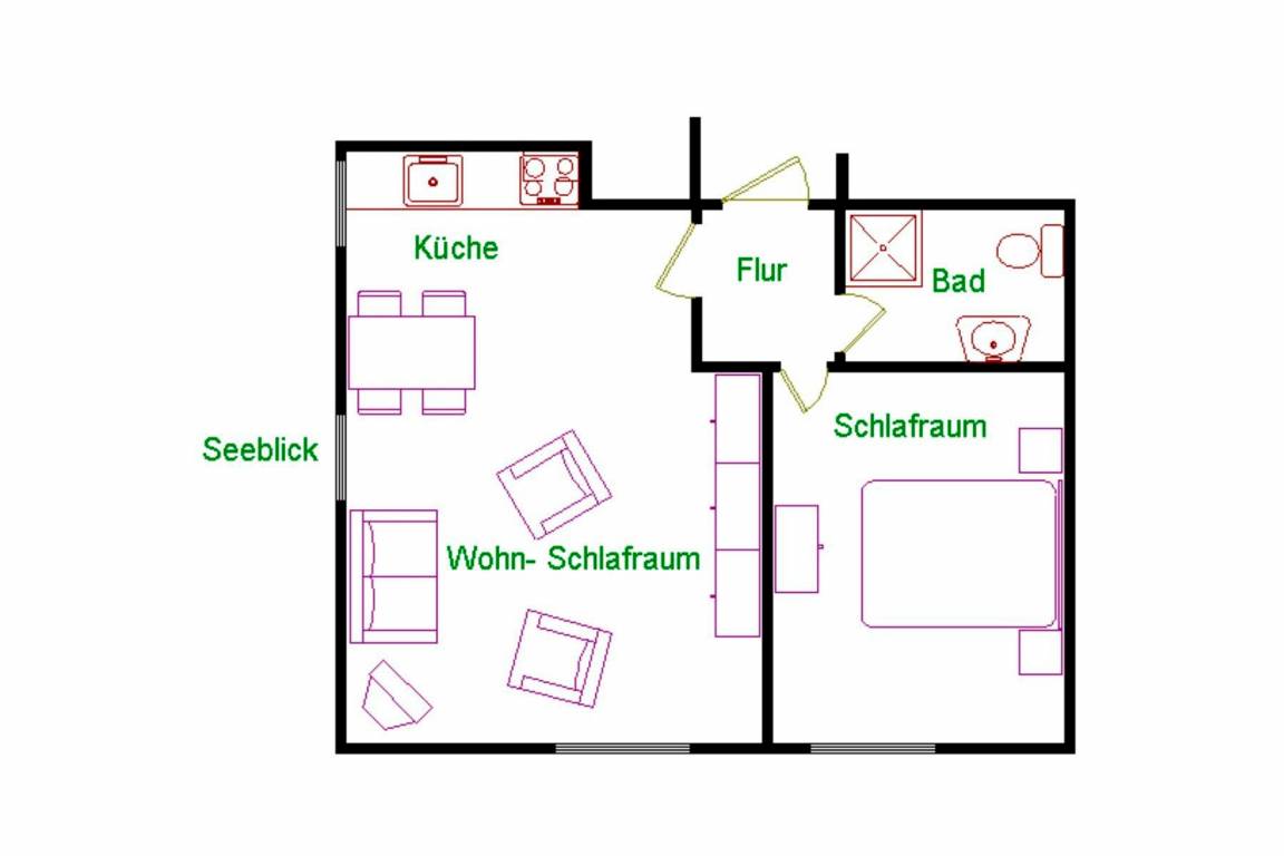 Das Zimmer umfasst eine Küchenzeile, Essecke mit Platz für bis zu zwei Personen, sowie ein Sofa mit zwei Sesseln. Die Kochnische ist mit folgenden ausgestattet: Cerankochfeld, Kühlschrank, Kaffeemaschine, Wasserkocher,Toaster, Mixer, Eierkocher ausreichend Kochtöpfe, Besteck und Geschirr . Das helle Bad ist mit einer Dusche versehen und bietet genug Platz für Ihre Utensilien. Die komplette Ferienwohnung verfügt über W-LAN.