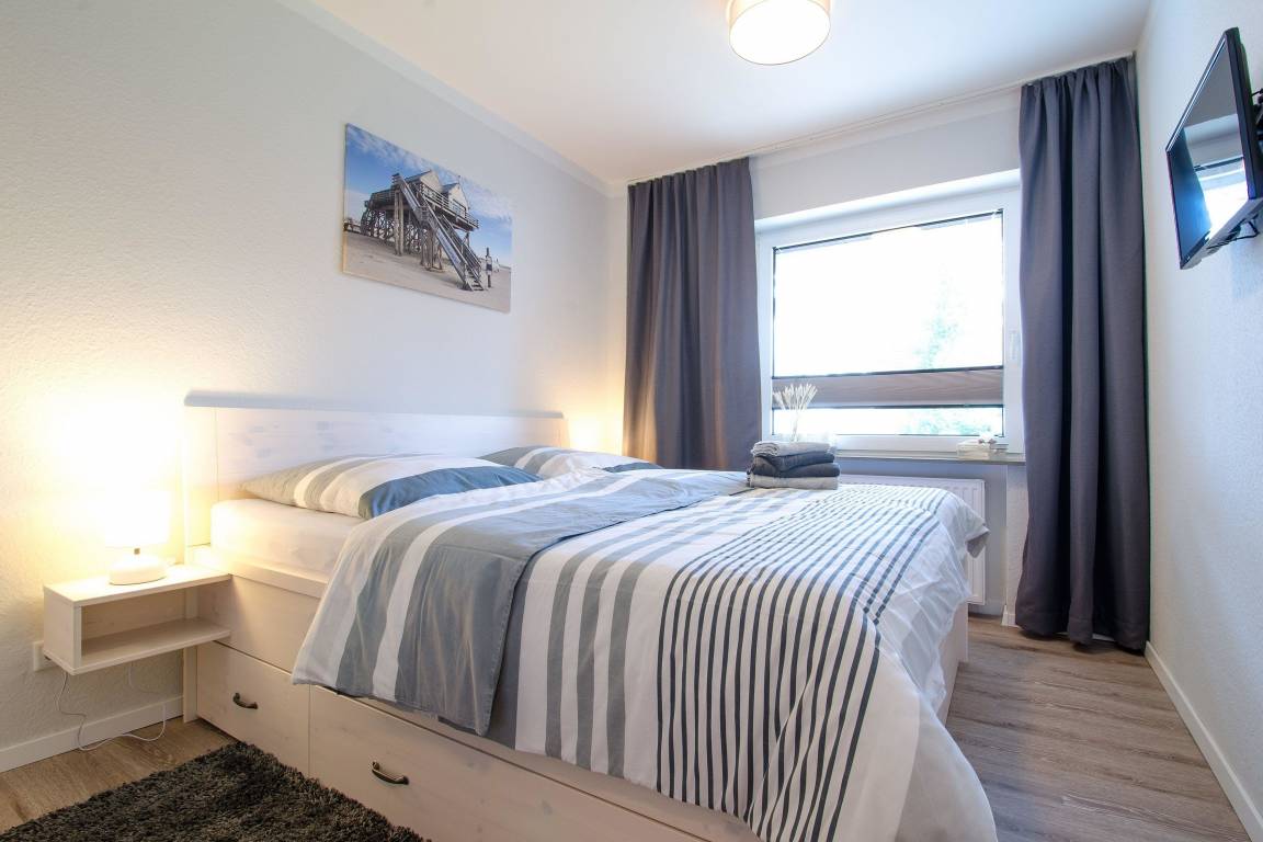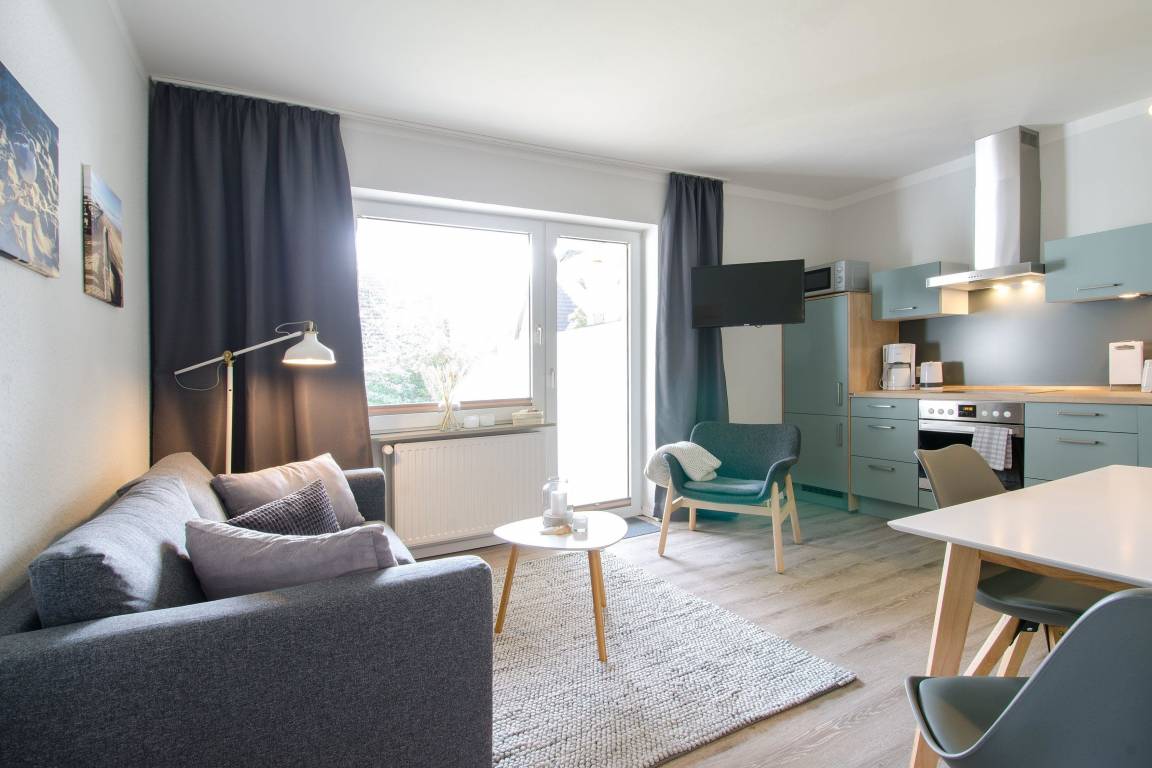 Ein gemütlicher Wohnraum mit Sat-TV, Radio und Essbereich, eine möblierte Terrasse, ein Schlafraum mit einem Doppelbett und TV, Bettwäsche und Handtücher können hinzugebucht werden, immer enthalten sind eine Duschmatte sowie Geschirrtücher und Spültuch. Vollausgestattete Küche mit Ceranfeld, Backofen, Kühlschrank, Geschirrspüler, Kaffeemaschine, Toaster, Wasserkocher. Bad mit ebenerdiger Dusche, Handtuchtrockner, WC und Fön, kostenfreies WLAN, überall Insektenschutz