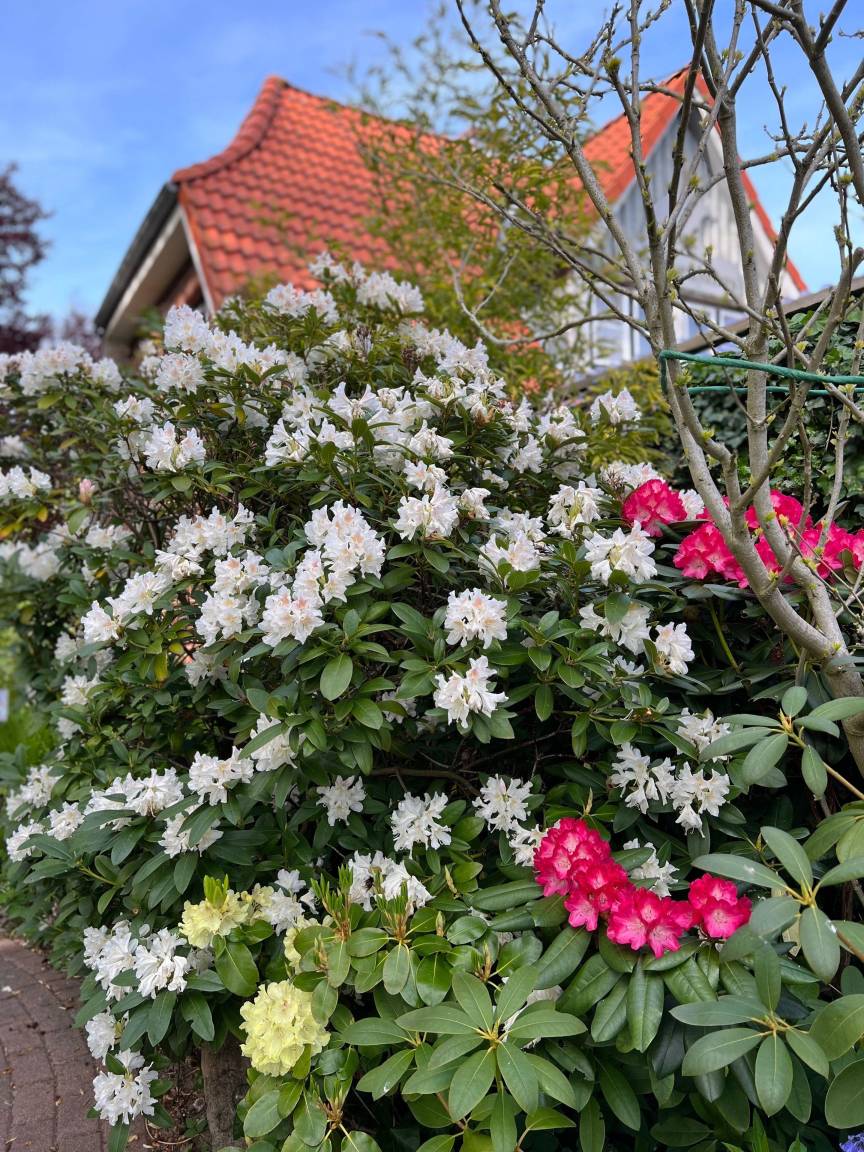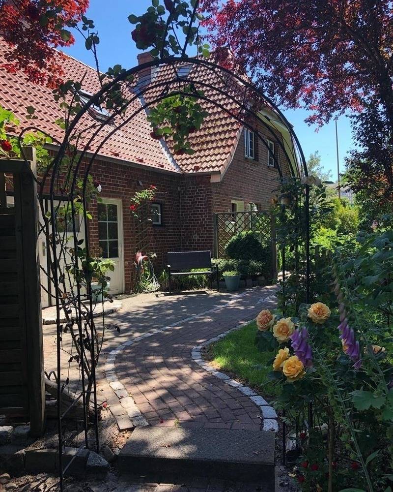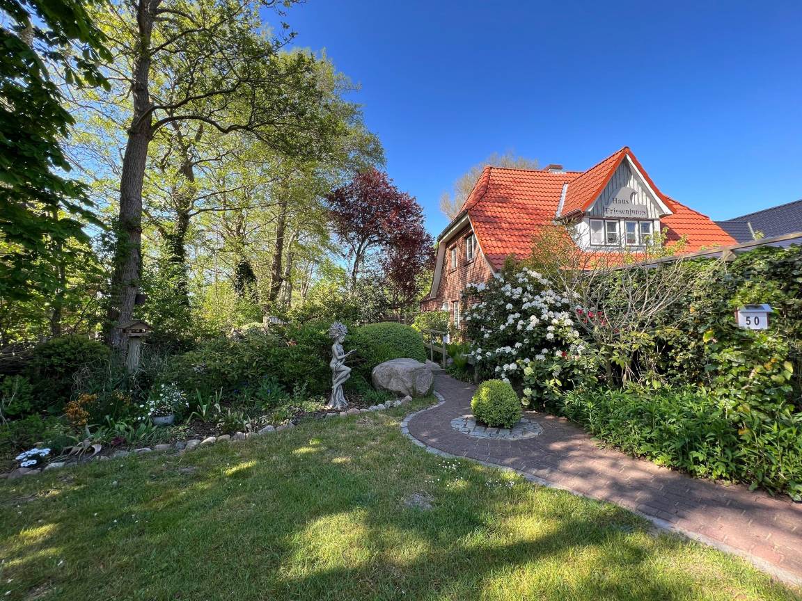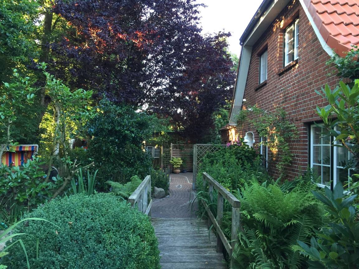 Das Haus "Friesenjungs" ist von Hecke, Garten und alten Bäumen umgeben.