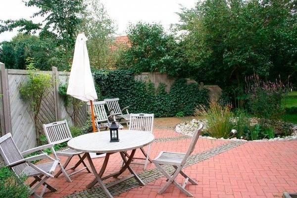 riesiger Garten mit separate Terrasse mit Teakmöbeln, Deckchairs und Parkplatz
