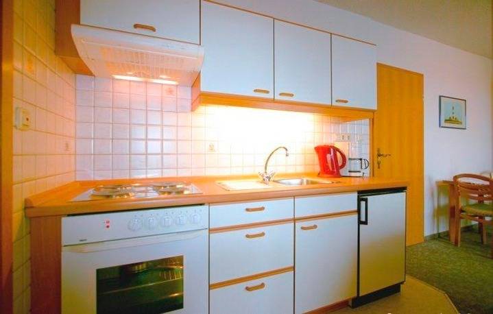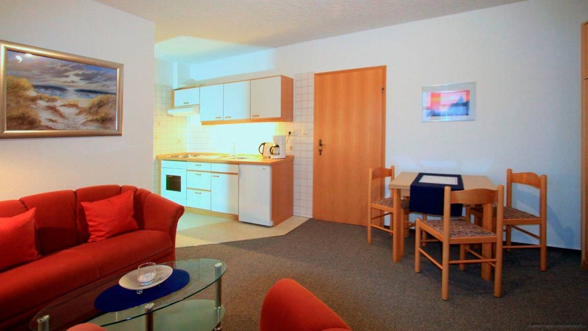 Die Ferienwohnung im Ferienhaus Achtern Diek verfügt über einen gemütlichen Wohn-Essbereich mit Küchenzeile. Die Ausstattung ist einfach und komfortabel gehalten und umfasst neben Geschirrspüler, Herd mit Ceranfeld, Kühlschrank verschiedene Kleingeräte wie Kaffeemaschine, Toaster und Wasserkocher. Eine Schlafmöglichkeit verbirgt sich hinter dem Schrankbett für zwei Personen. Der Boden ist mit Teppich ausgelegt.