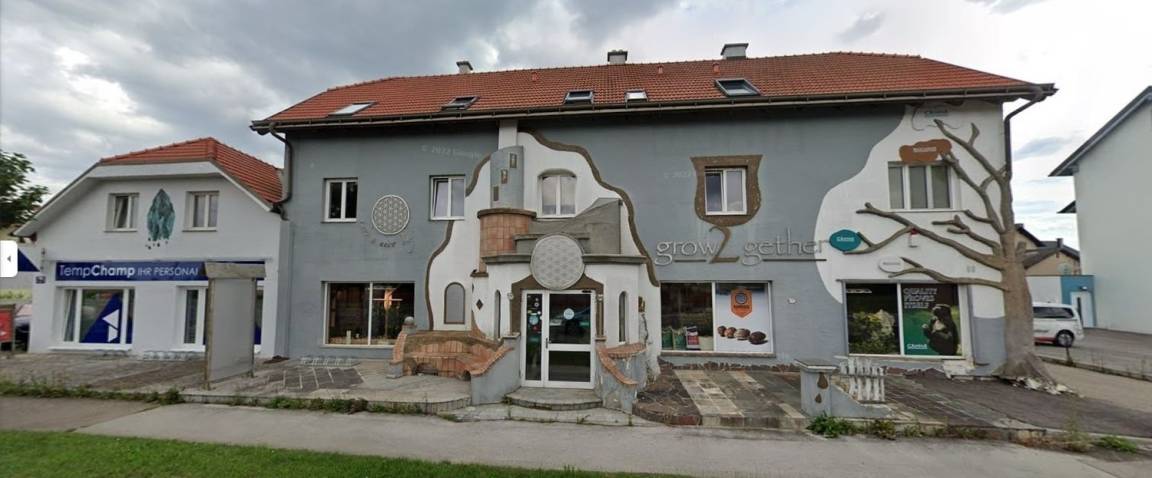 Die Anlage ist von außen sofort erkennbar durch die eigenwillige Fassadengestaltung, dessen eine Hausecke ein riesengroßer Baum ziert.