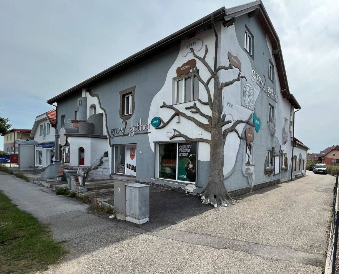 Die Anlage ist von außen sofort erkennbar durch die eigenwillige Fassadengestaltung, dessen eine Hausecke ein riesengroßer Baum ziert.
