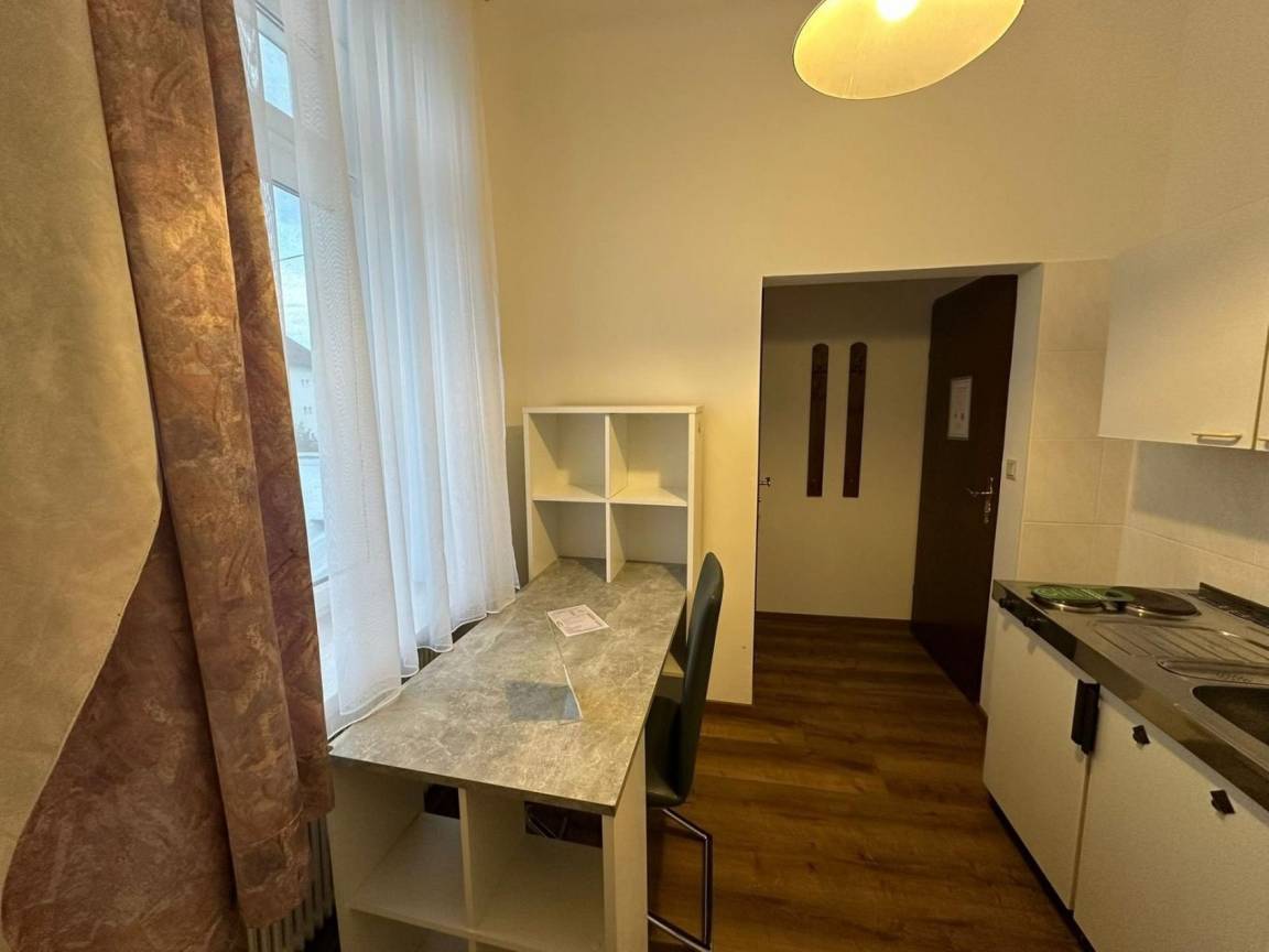 Das besonders große und geräumige Einzelzimmer Nr. 112 im 1. Stock mit einem Vorraum ist ausgestattet mit einem Einzelbett, Schreibtisch, TV, WLAN, Duschbad/WC sowie einer Miniküche. Das Pensionszimmer befindet sich zur verkehrberuhigten Seitenstraße, Die schalldichten Fenster sorgen zusätzlich für eine angenehme Nachtruhe.