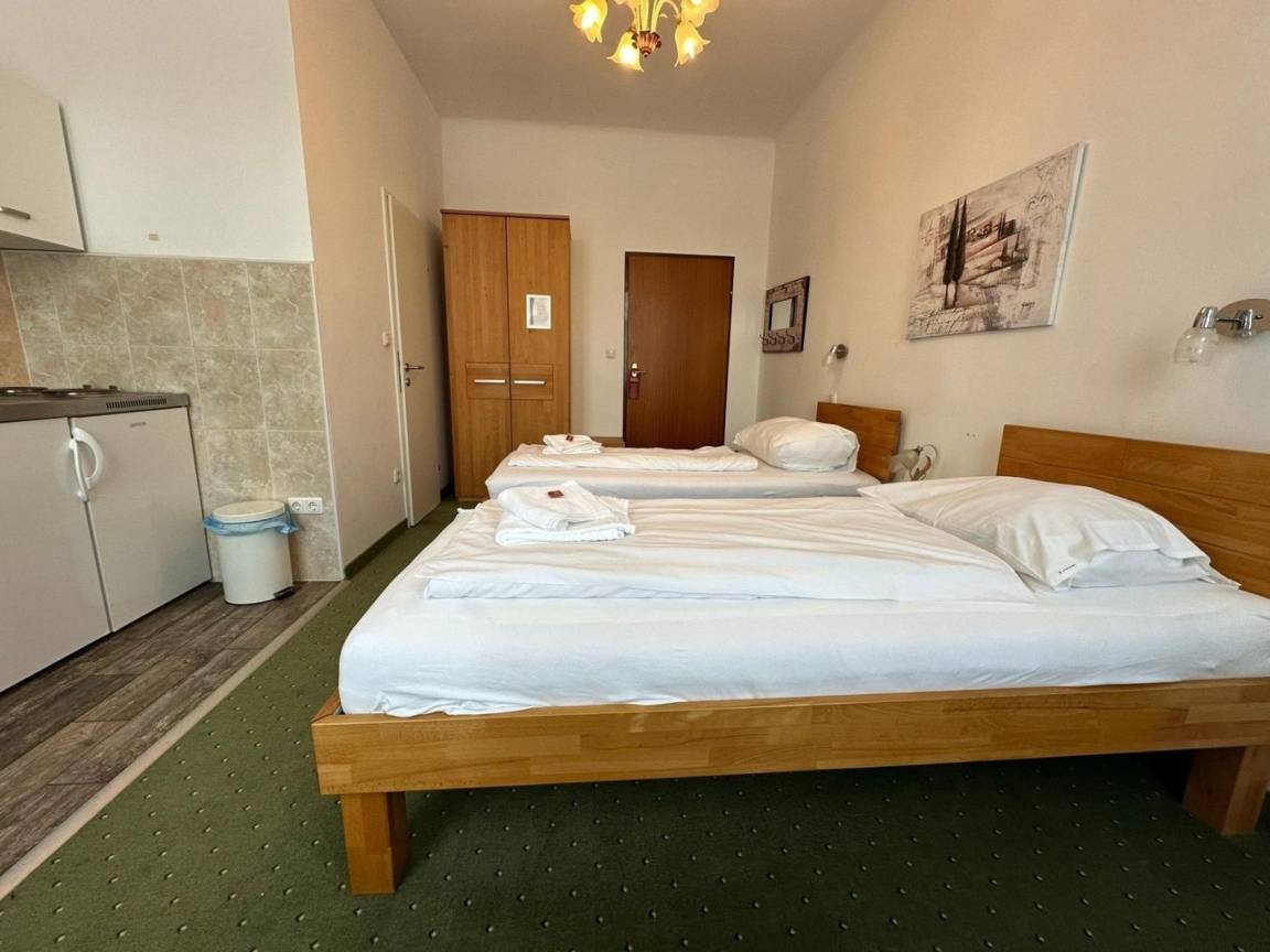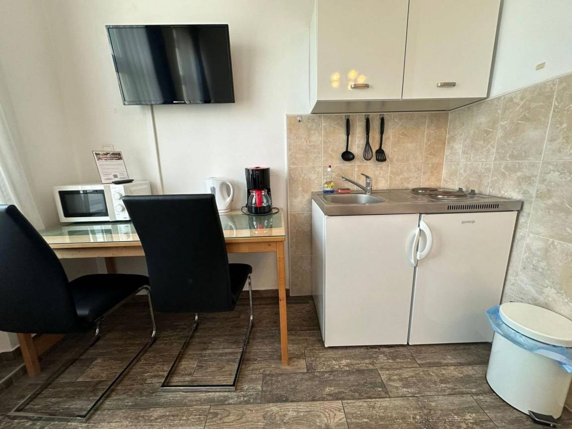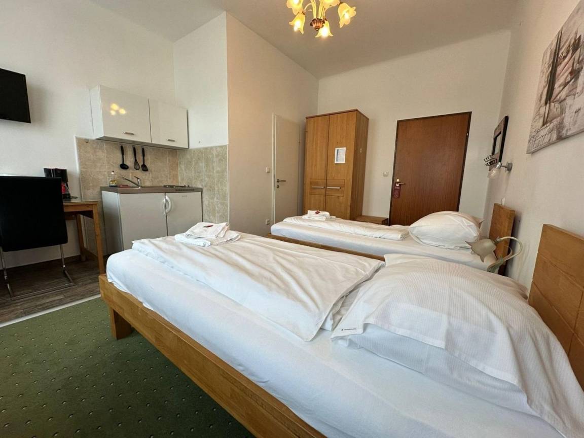 Ihr Studio Nr. 106 im 1. Stock ist ausgestattet mit 2 Einzelbetten s, zusätzlich Schreibtisch, TV, WLAN, Duschbad/WC und kleiner Küche. Das Studio befindet sich auf der Straßenseite zur Mariazellerstraße. Die schalldichten Fenster sorgen für eine angenehme Nachtruhe.