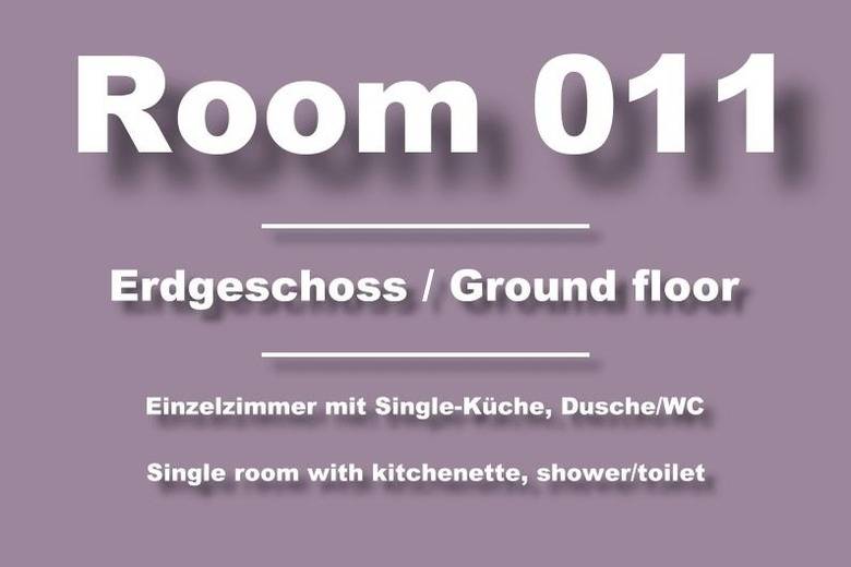 Ihr Einzelzimmer Nr. 011 ist ausgestattet mit einem Einzelbett, TV, WLAN, Duschbad/WC sowie einer Miniküche. Das Pensionszimmer befindet sich auf der Seite einer bverkehrsberuhigten Einbahstraße. Die schalldichten Fenster sorgen für eine angenehme Nachtruhe.