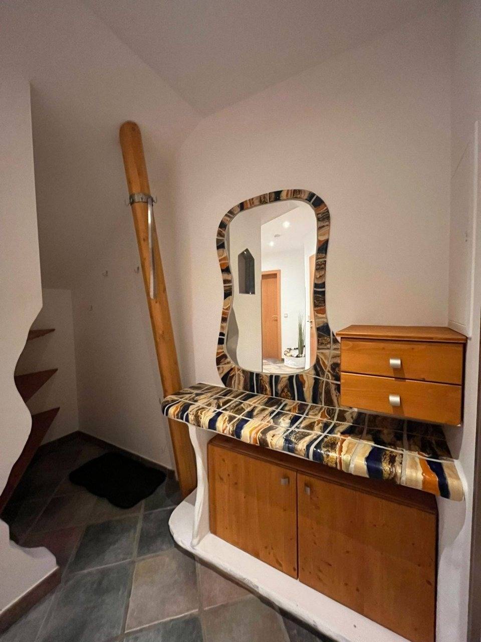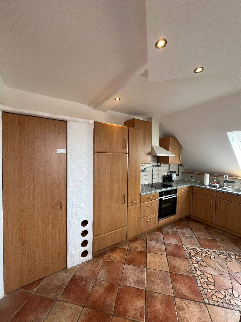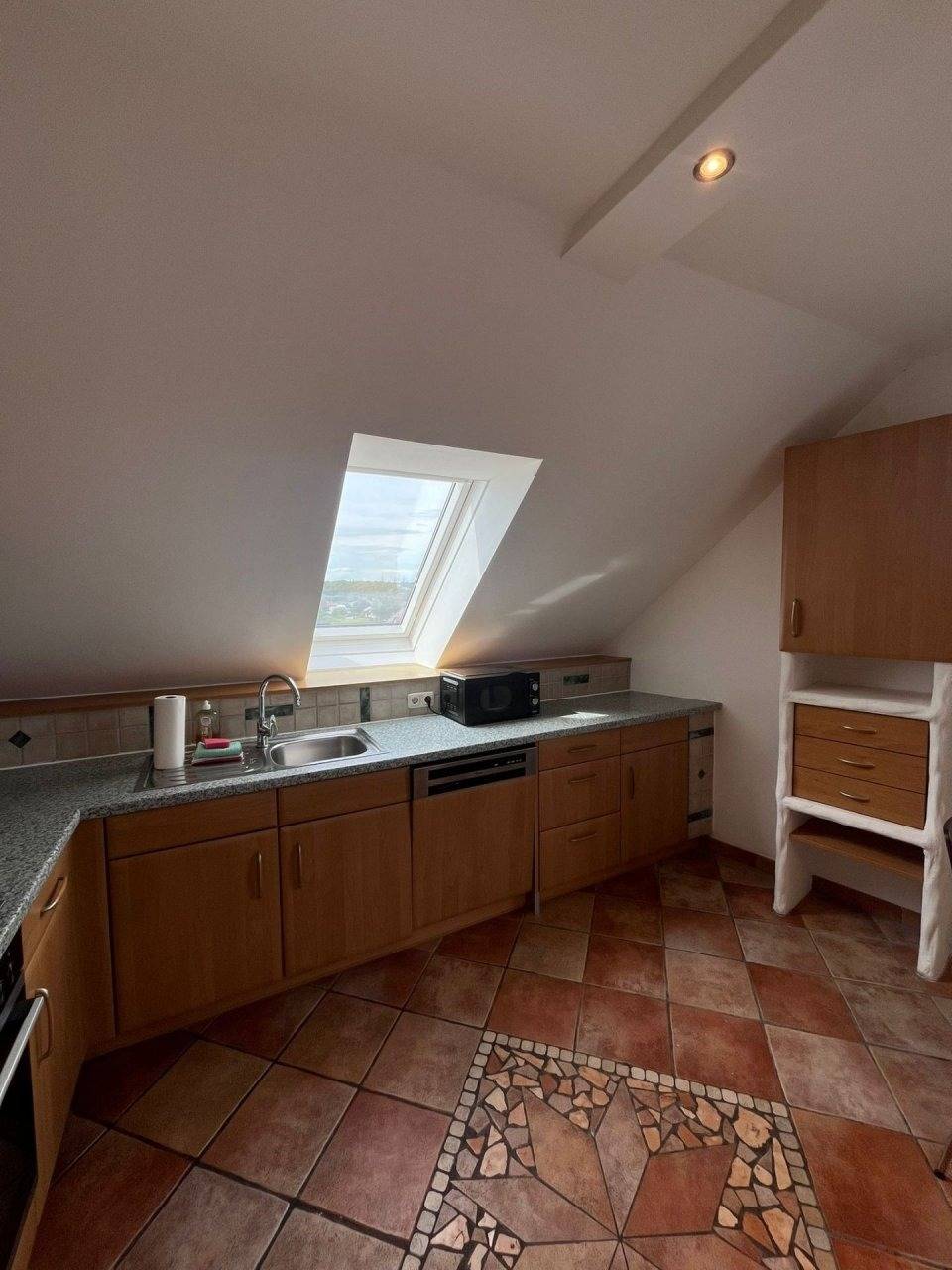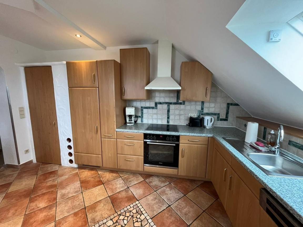 Das Apartment im 2. Stock ist ausgestattet mit kompletter Küche, Herd, Backofen, Mikrowelle, Kühlschrank mit Gefrierfach und Waschmaschine (10 kg).