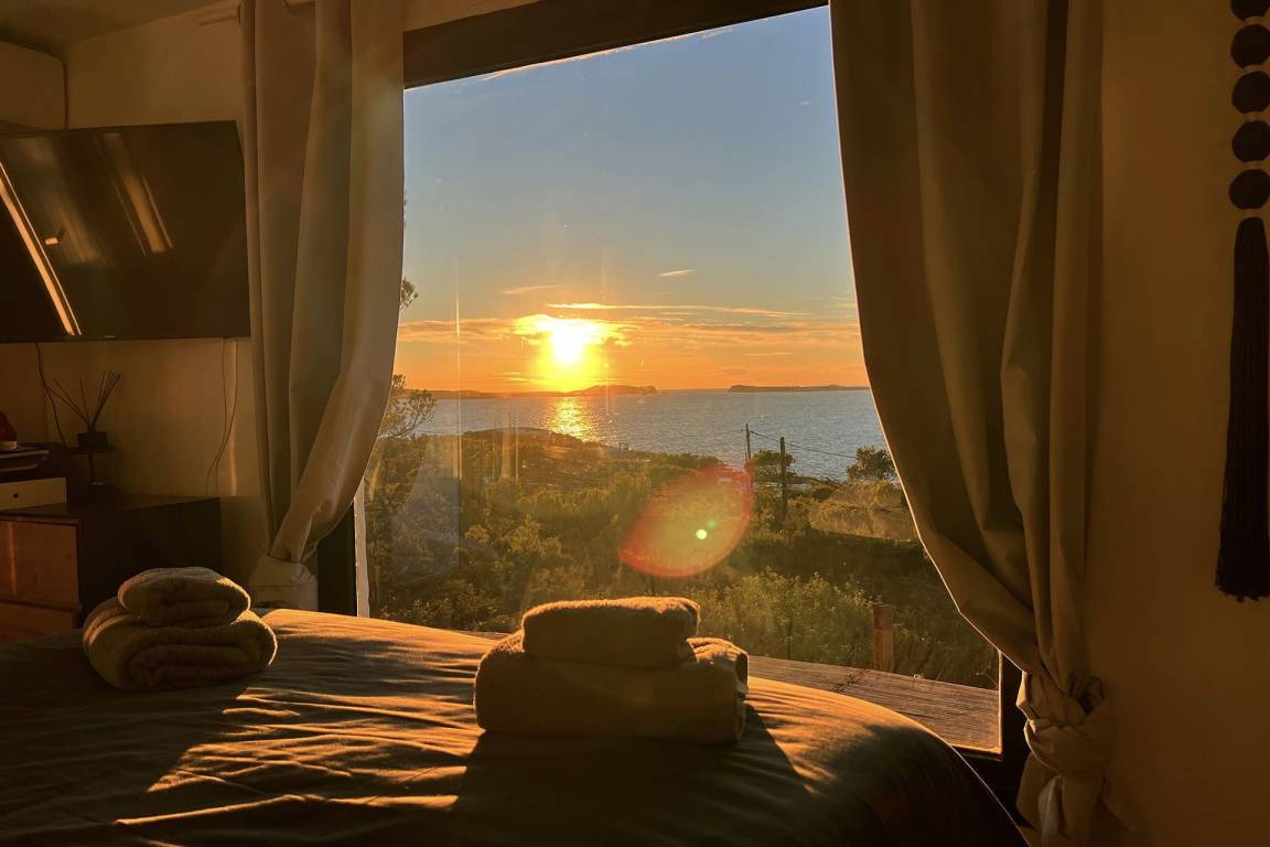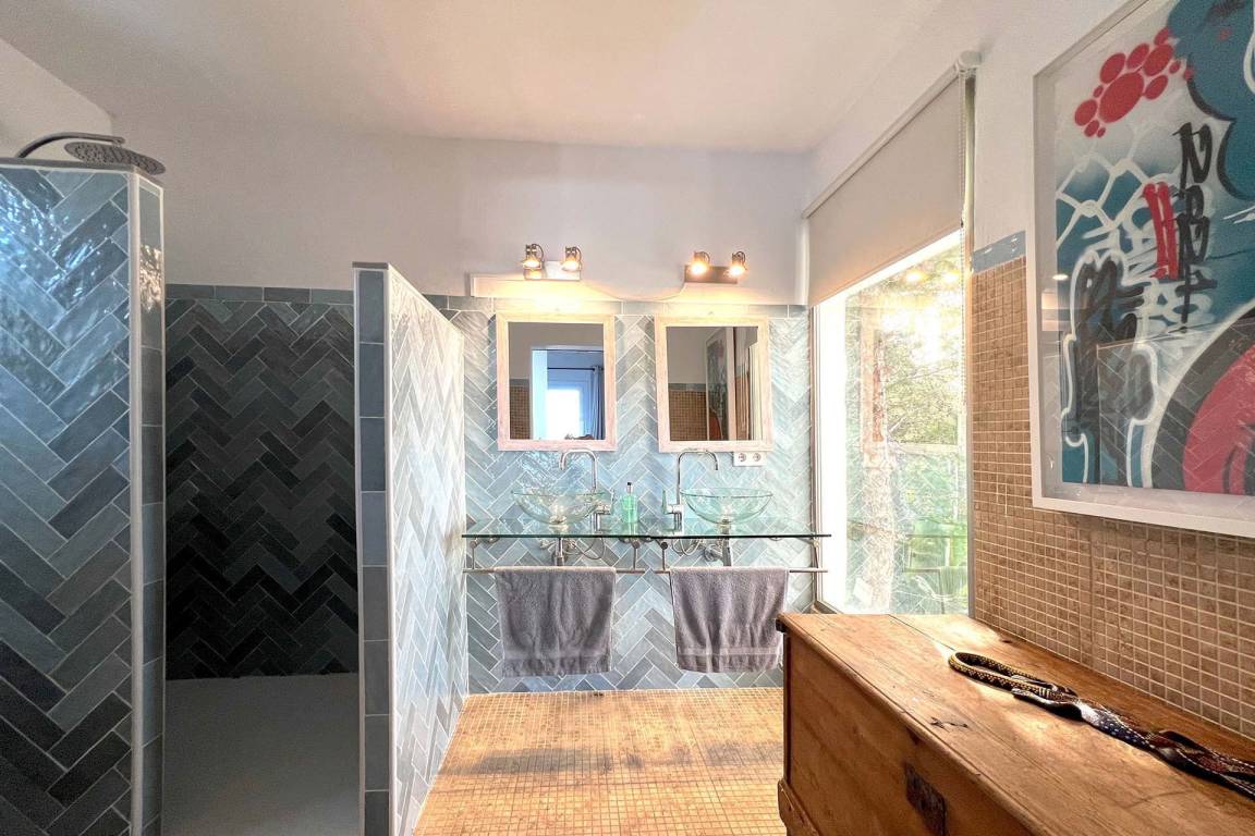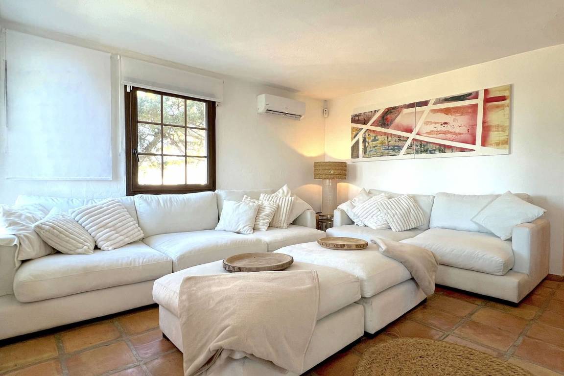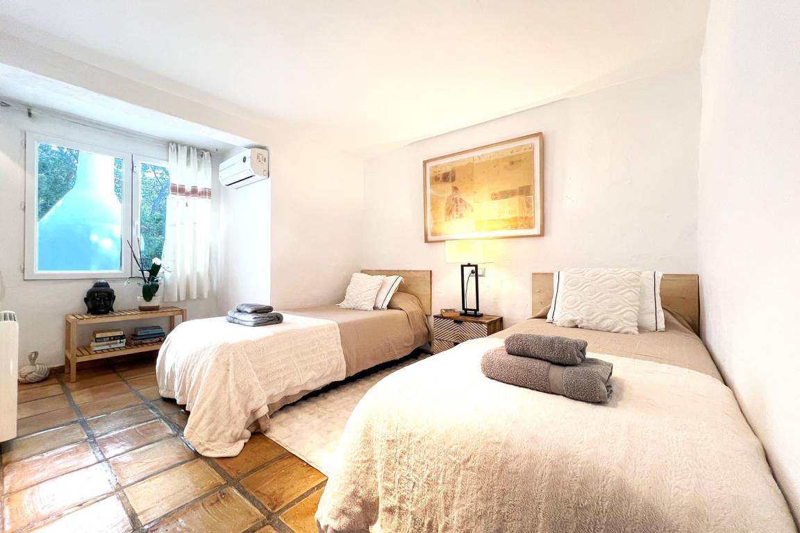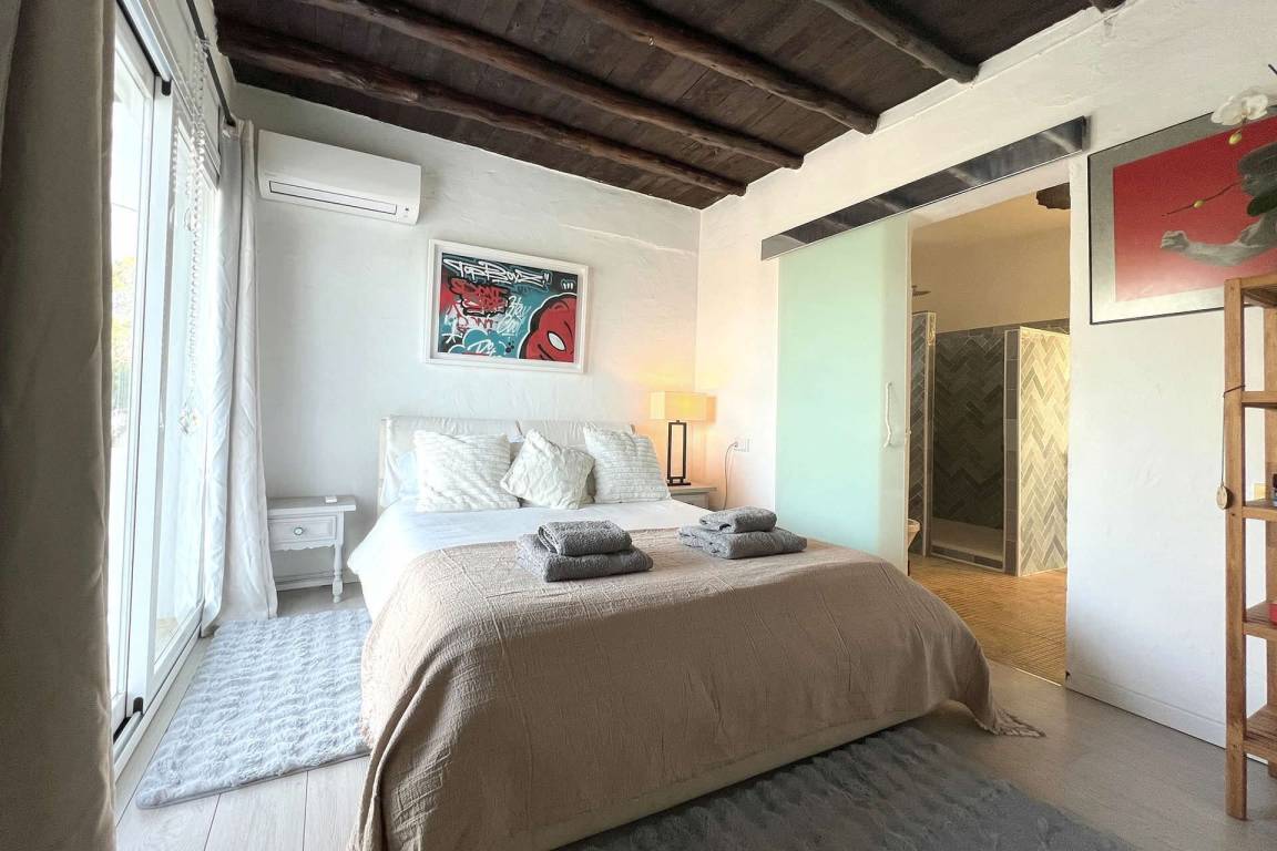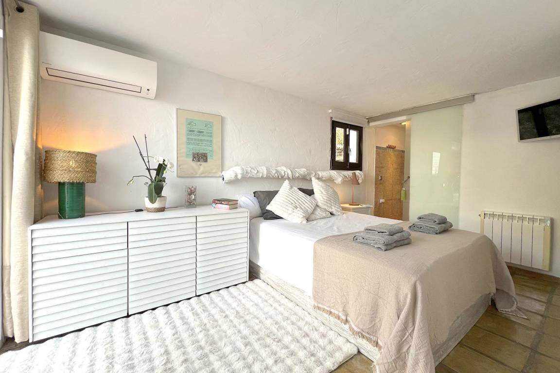 Die Villa umfasst 4 Schlafzimmer und 4 Bäder und bietet Platz für bis zu 8 Gäste. Die Schlafzimmer sind über die Immobilie verteilt und ermöglichen eine ausgewogene Aufteilung zwischen gemeinschaftlichen Wohnbereichen und privaten Rückzugsräumen. Die Wohnräume und der Essbereich öffnen sich zu den Außenbereichen hin. Eine überdachte Terrasse ist von den Hauptwohnbereichen aus zugänglich und dient als Essbereich im Freien.