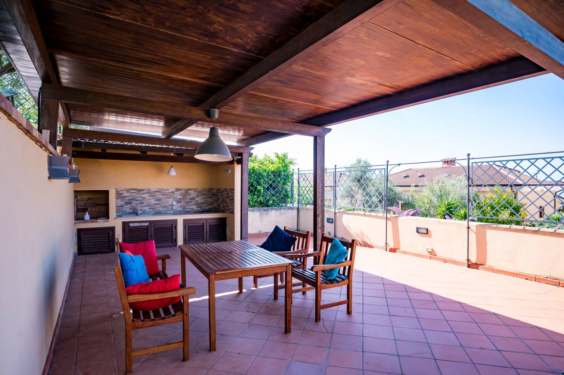 The pool and pool area are located on a terraced property right across from the house Villa Capone is located in. At ground level lies a large, roofed terrace with outdoor kitchen, on the upper level the pool area with loungers and sunshade. More areas for sunbathing and relaxing are found above the pool. Let your gaze drift from every level: The higher you climb, the more breathtaking the coastal panorama you look out over.