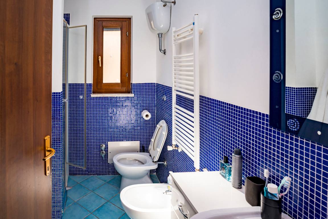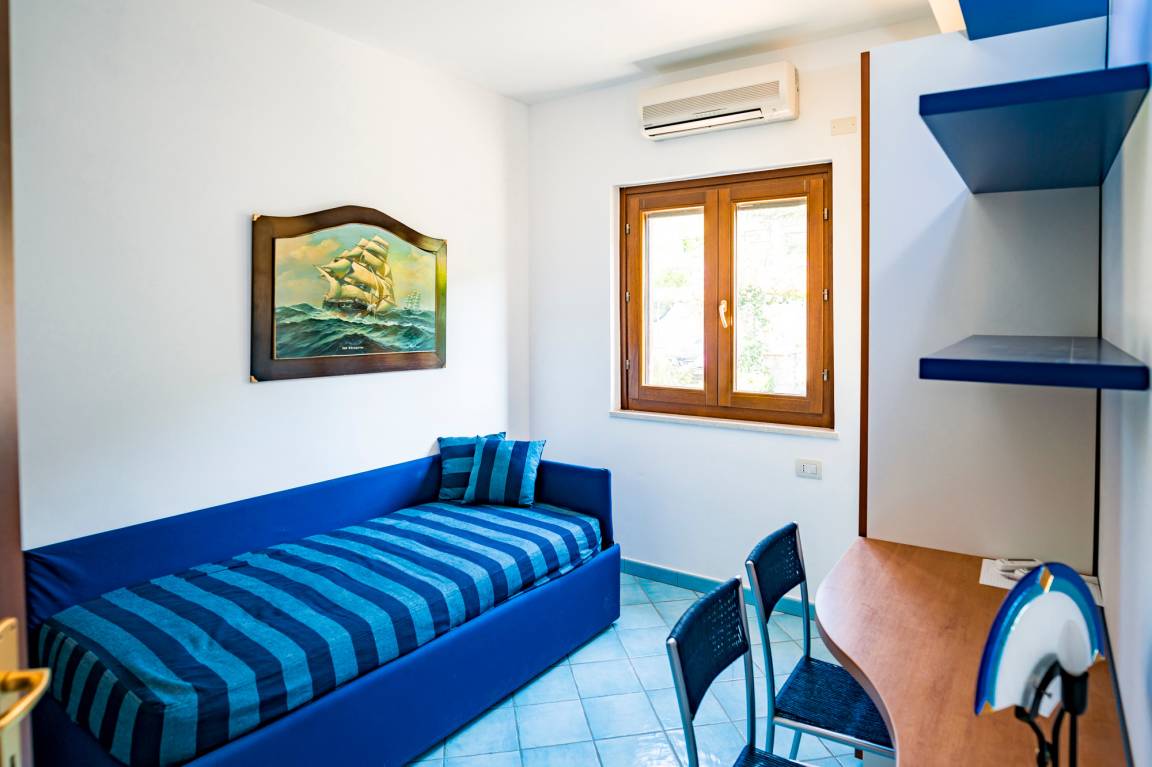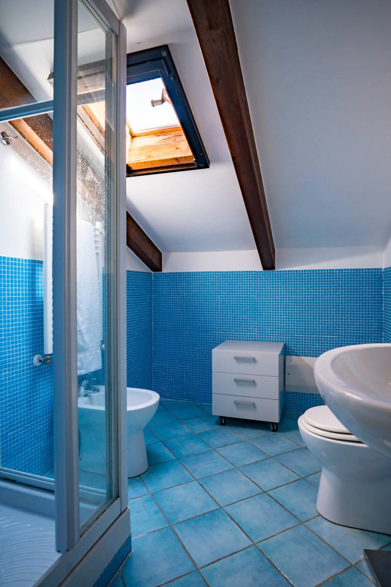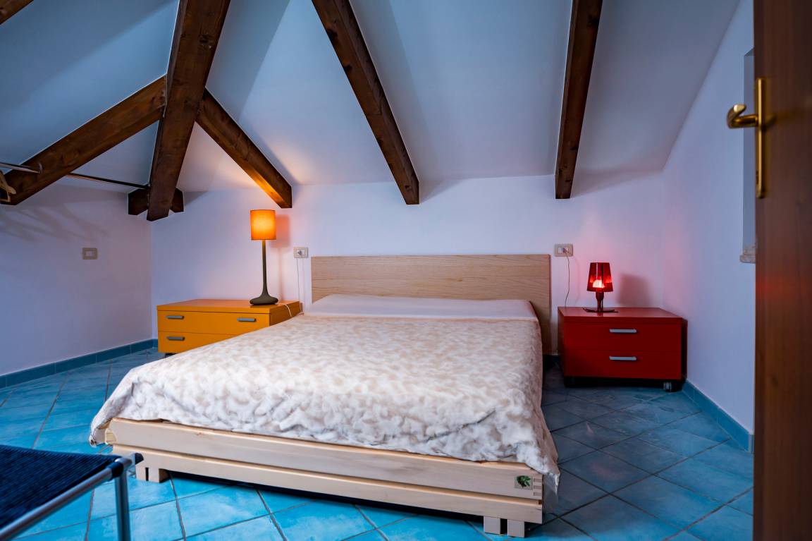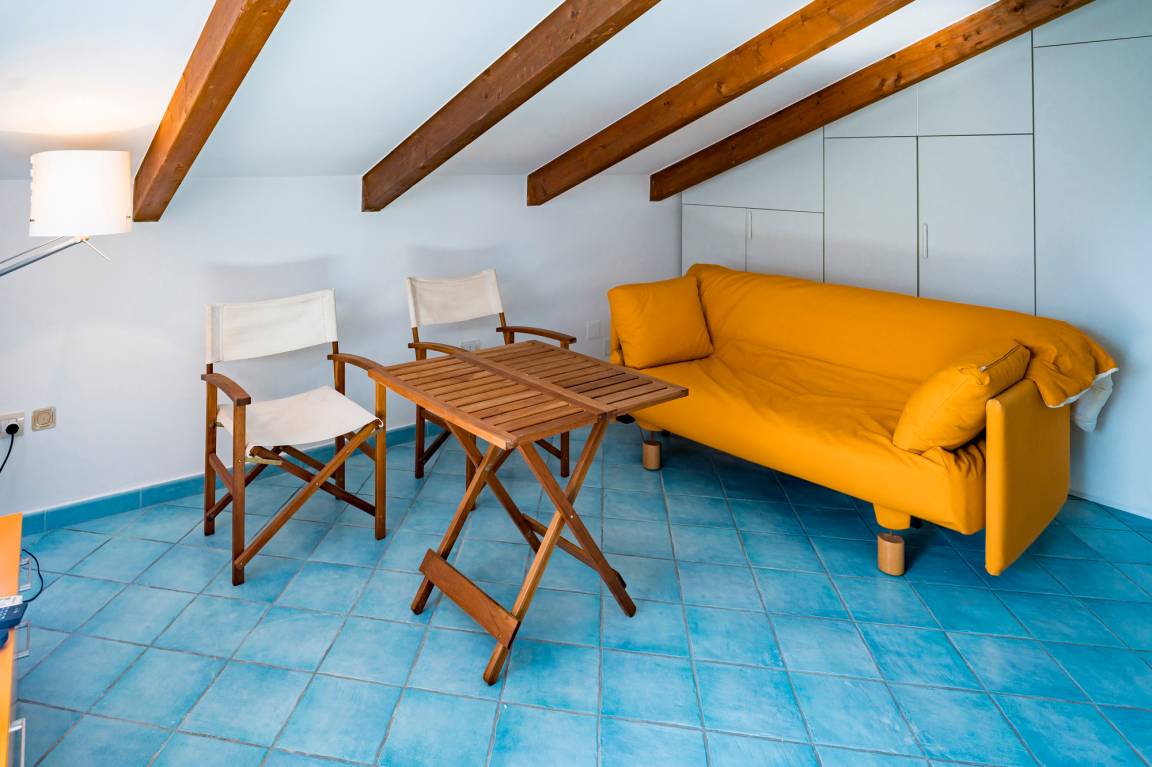 The attic floor of Villa Capone includes a bedroom (double bed), a small living/sleeping room with a sofa bed for one to two children/teenagers and a bathroom (shower/WC/bidet). There is also a small roof terrace with sea view and outdoor shower.