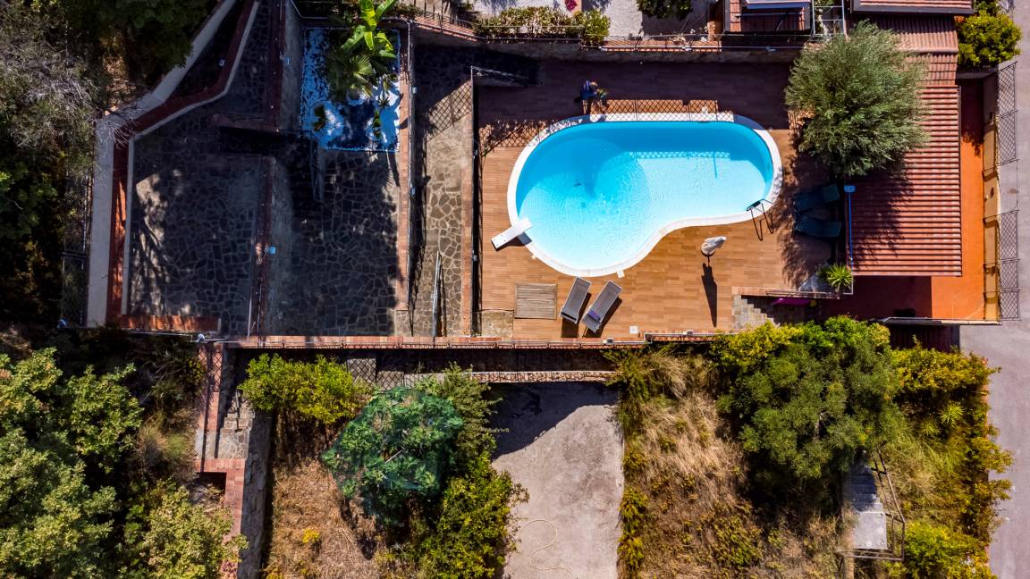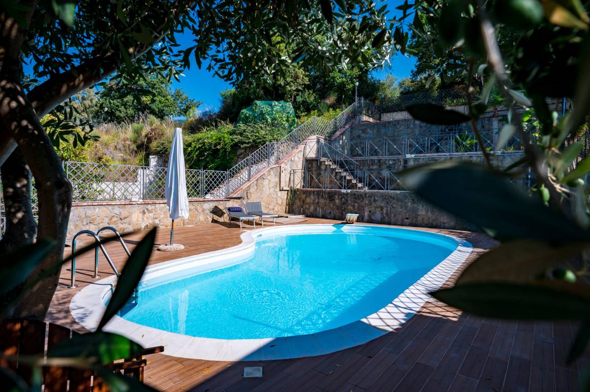 Zum privaten Pool, der sich auf einem terrassierten Gelände direkt gegenüber der Villa Capone befindet, gelangt man über den Parkplatz, der sich vor dem Haus erstreckt. Auf der ersten Ebene erstreckt sich eine große, überdachte Terrasse mit Außenküche. Auf der darüber liegenden Ebene befindet sich der Poolbereich mit Liegen und Sonnenschirm. Weitere Bereiche zum Sonnen und Relaxen finden Sie oberhalb des Pools. Je höher Sie steigen, desto atemberaubender wird das Küstenpanorama, das sich Ihnen bietet.