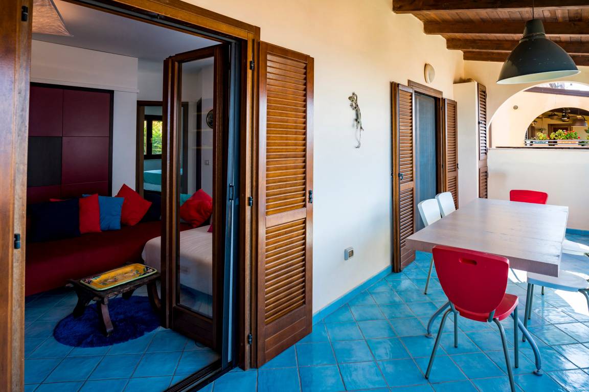 Dominiert wird die untere Etage der Villa Capone vom gemütlichen Wohnzimmer, an das sich eine offene Küche anschließt. Davor erstreckt sich auf der gesamten Breite eine überdachte Meerblickterrasse mit Esstisch und Stühlen. Auf der Etage befinden sich außerdem ein Badezimmer sowie ein Doppel- und ein Einzelzimmer.