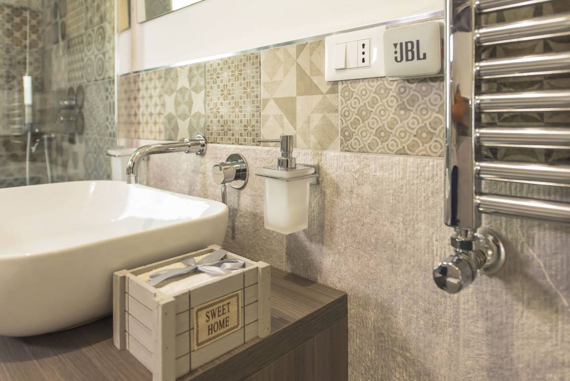 Badezimmer: Waschbecken, WC, Bidet, Dusche.