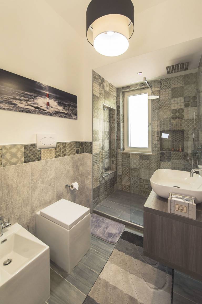 Badezimmer 1 (8 m²): Waschbecken, WC, Bidet, Dusche, Fön, WiFi Internet.