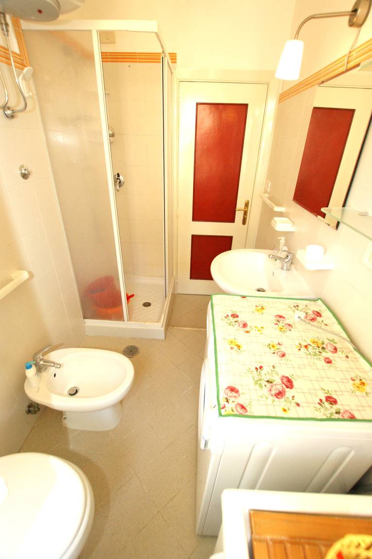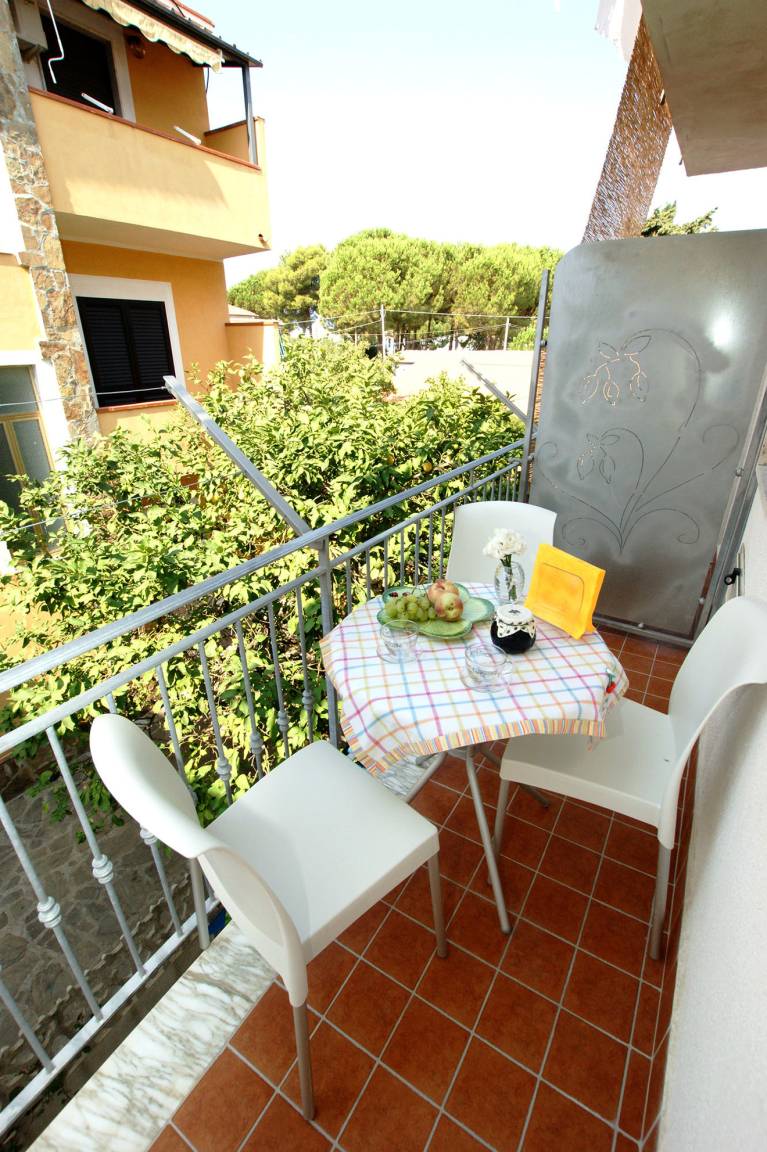 The apartment also features: TV, air conditioning, WIFI, washing machine, children's bed. The balcony is furnished with a table and seating accommodations. There's an outdoor shower for shared use.