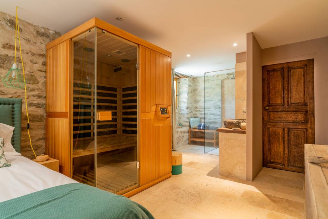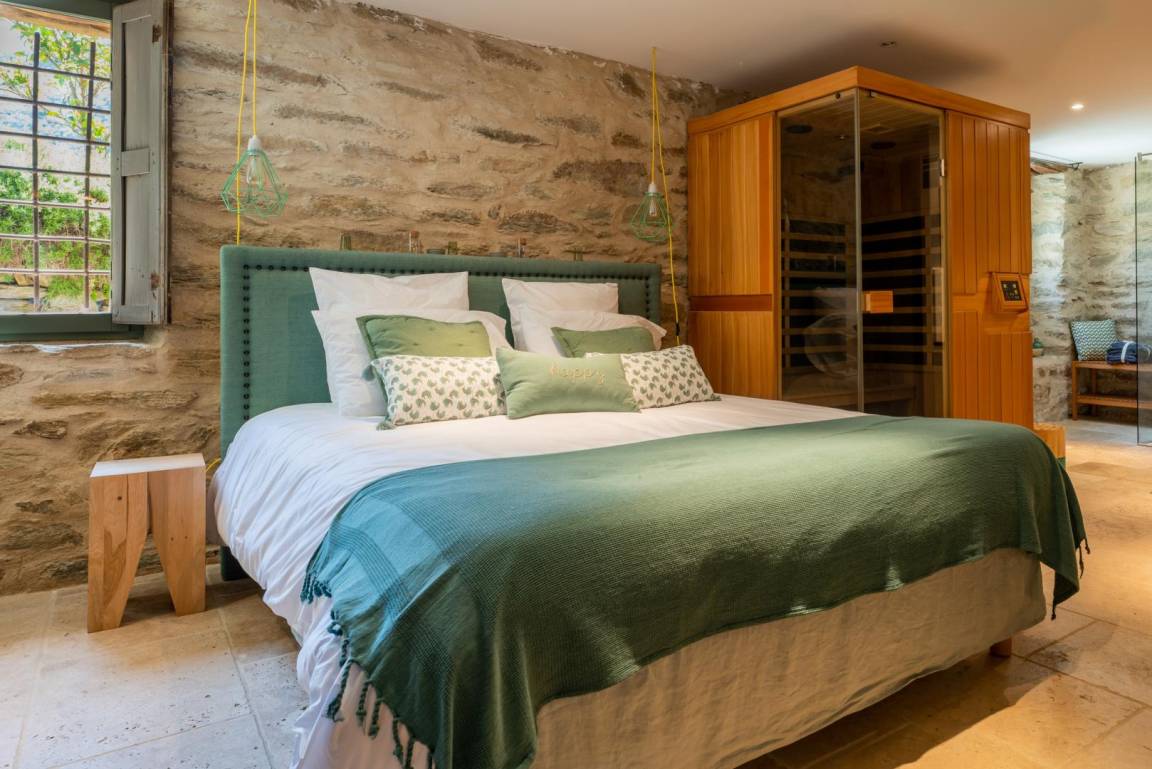 - Saleccia Schlafzimmer, darunter 1 Bett 140x190 cm mit offenem Bad zum Schlafzimmer (begehbare Dusche), Sauna und eigenem WC