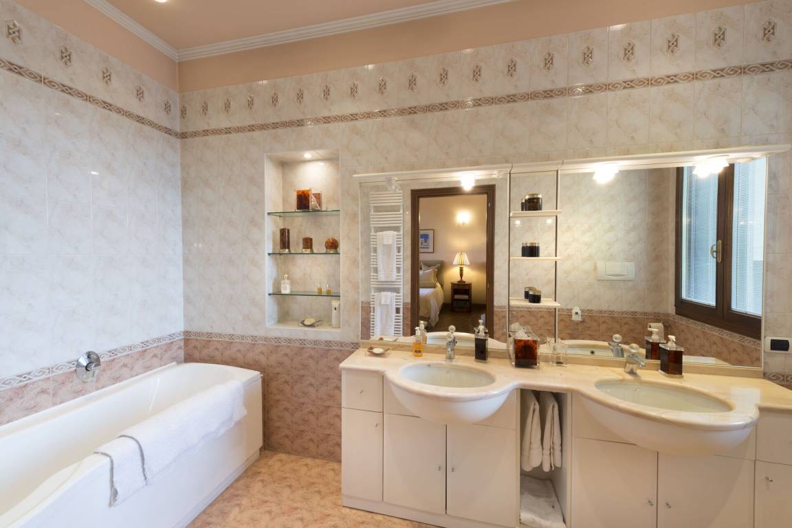 Badezimmer 2: Whirlpool-Badewanne, Waschbecken, WC, Bidet, Fön, WiFi Internet.