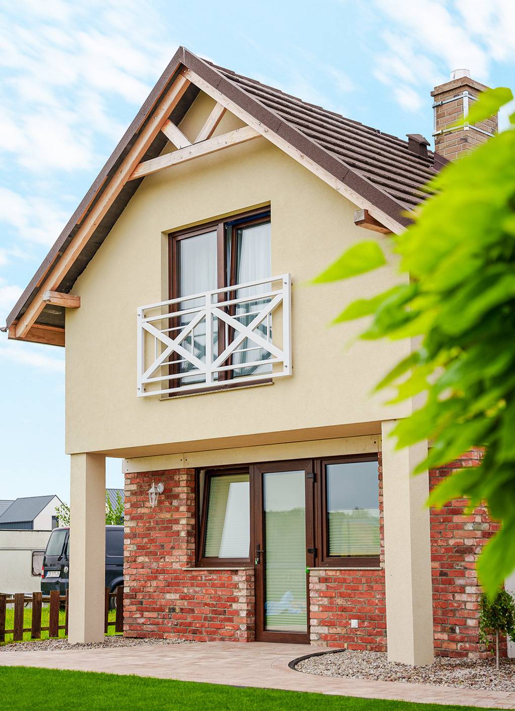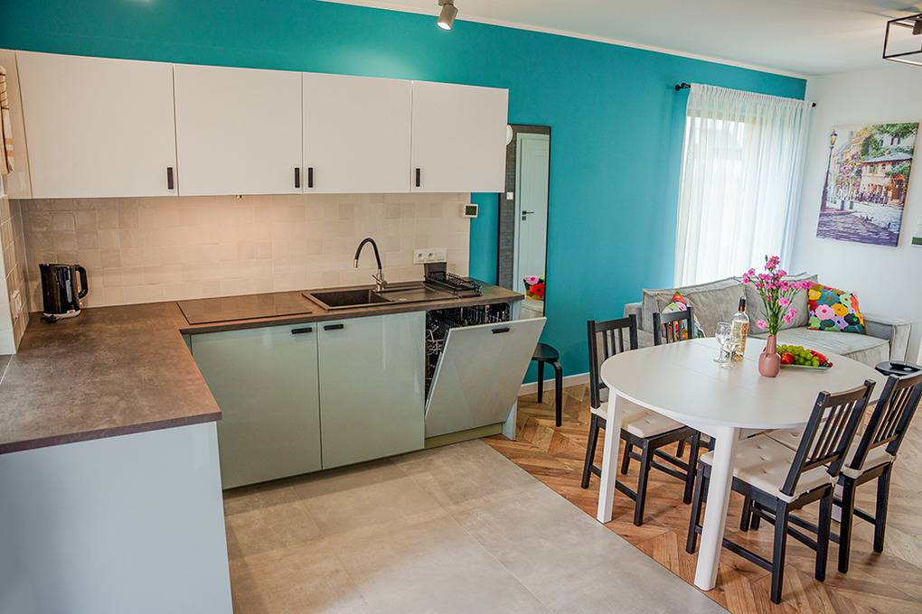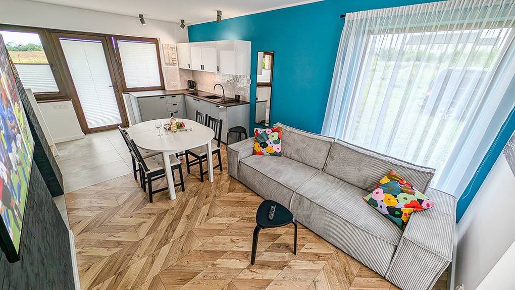 Haus: Zwei komfortable, einzelnstehende Ferienhäuser, in 2024 neu erbaut, in einer kleinen Ferienanlage mit 4 Ferienhäusern und 4 Ferienwohnungen. Moderne, geschmackvolle Einrichtung. Kostenloses Internet (WiFi). Fußbodenheizung, Warmwasser über E-Boiler (120 l). Terrasse mit Sitzmöbeln, Grill. In der Anlage: Kinderspielplatz mit Rutsche, Schaukel, Sandkasten.