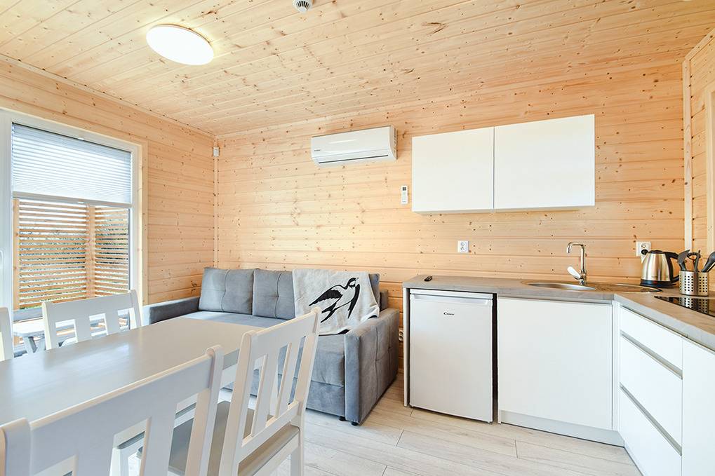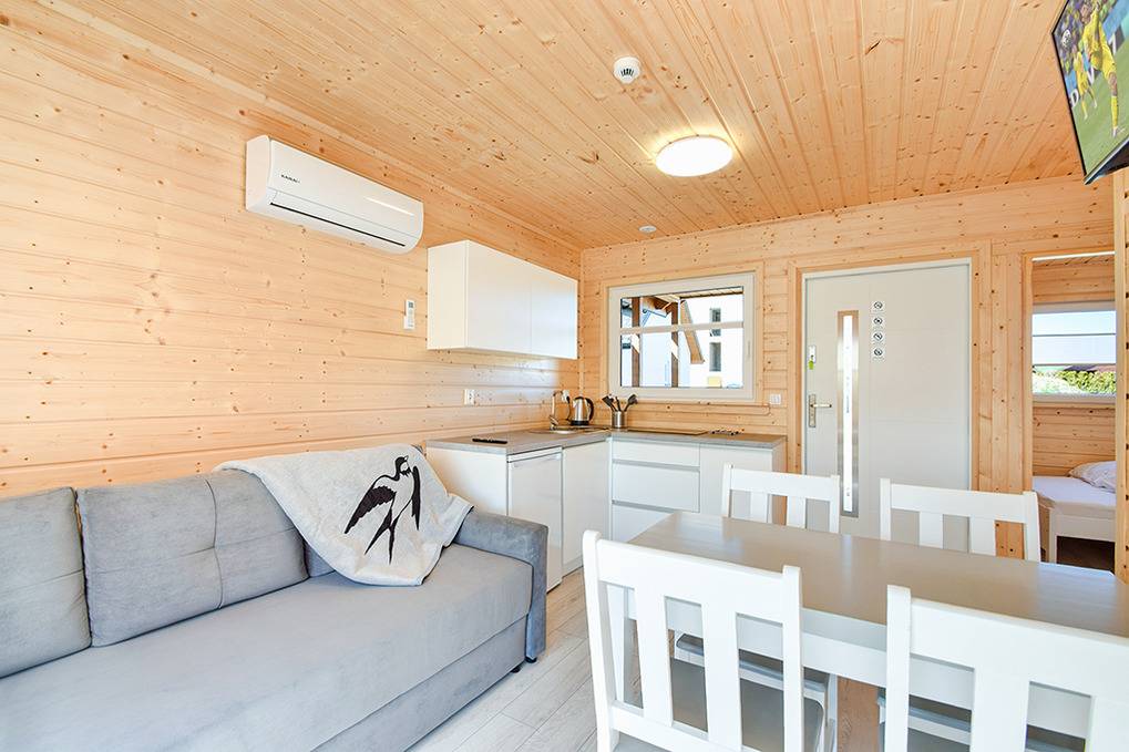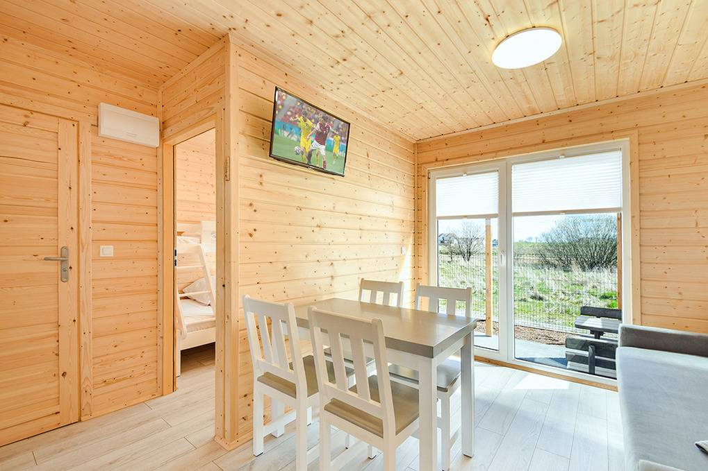 PL 55.35 Ferienhaus 1-5 Pers.: 3-Zimmer-Ferienhaus mit 48 qm Wohnfläche. Wohn-/Essraum mit Sofa, Flachbild Sat-TV mit deutschen Programmen, Esstisch, Küchenzeile (2 Induktionsplatten). Bad/WC. Doppelzimmer mit franz. Doppelbett. 3-Bettzimmer mit Etagenbett für 3 Pers. (unten 140 cm breit, oben 80 cm breit). Terrasse mit Sitzmöbeln, Grill.