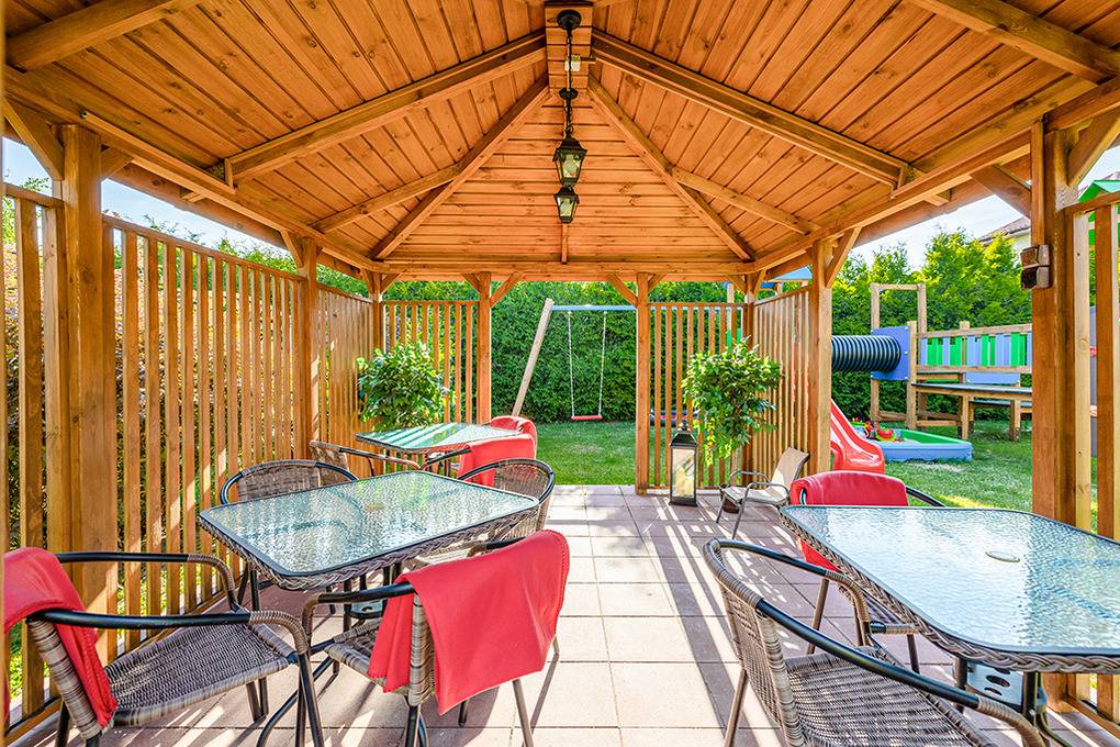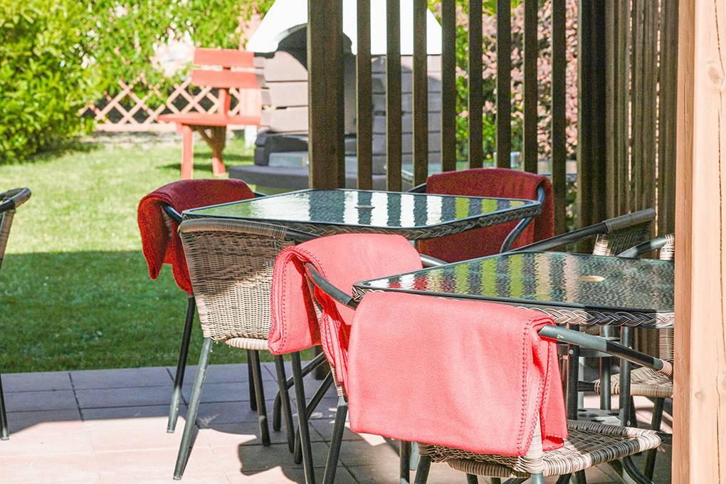 Haus: Moderne Ferienanlage mit Reihenhäusern und Ferienwohnungen. Schöner Kinderspielplatz mit Rutsche, Schaukel, Sandkasten, Sitzecke umgeben von einer großen Rasenfläche. Parkplatz auf umzäunten Grundstück. Großzügige, komfortable Reihenhäuser. Nichtraucherhaus. Geschmackvolle, moderne Einrichtung. Kostenloser Internetzugang über W-Lan. Zentralheizung. Kleine Terrasse mit Sitzmöbeln.