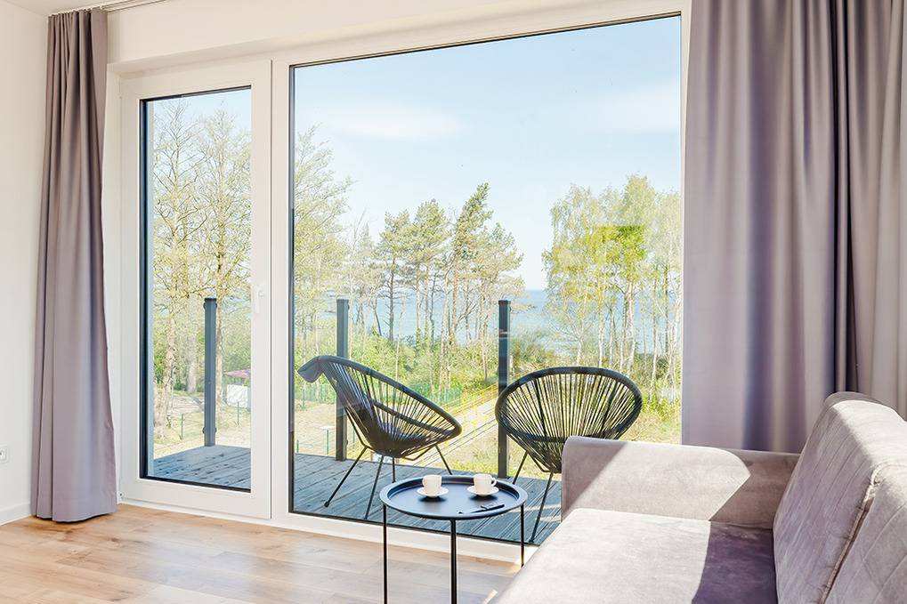 PL 55.30 Wohnung 1-4 Pers. mit direktem Wasserblick: Exklusive 2-Zimmerwohnung mit 42 qm Wohnfläche, 1. oder 2. Etage. Schöner Wohn-/Essraum mit Sofa (Ausziehcouch 2 Pers.), Sat-TV (deutsche Programme), rundem Esstisch, moderner, gut ausgestatteter Küchenzeile (Induktionsherd 2 Platten, Mikrowelle, Kaffee-Espresso-Maschine, Spülmaschine). Schönes Doppelzimmer. Modernes Bad mit ebenerdiger, durch Glaswand abgetrennter Regenwald-Dusche, Wb, WC. Highlight ist der schöne Balkon mit Sitzmöbeln und herrlichem, direktem Wasserblick.