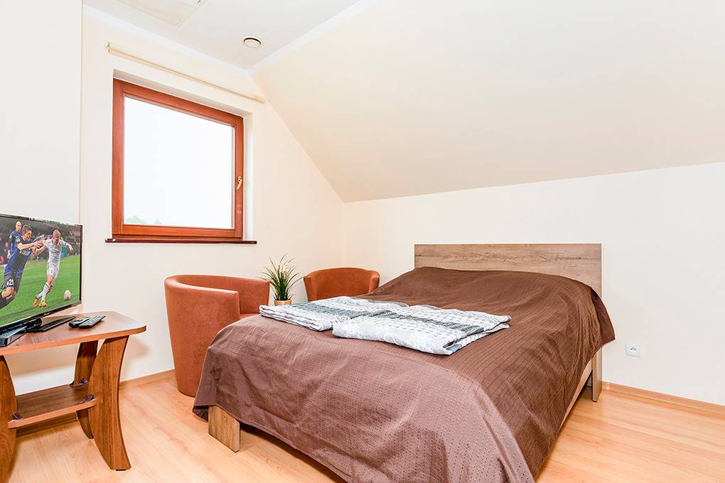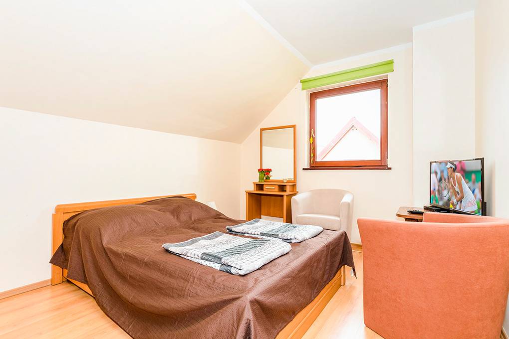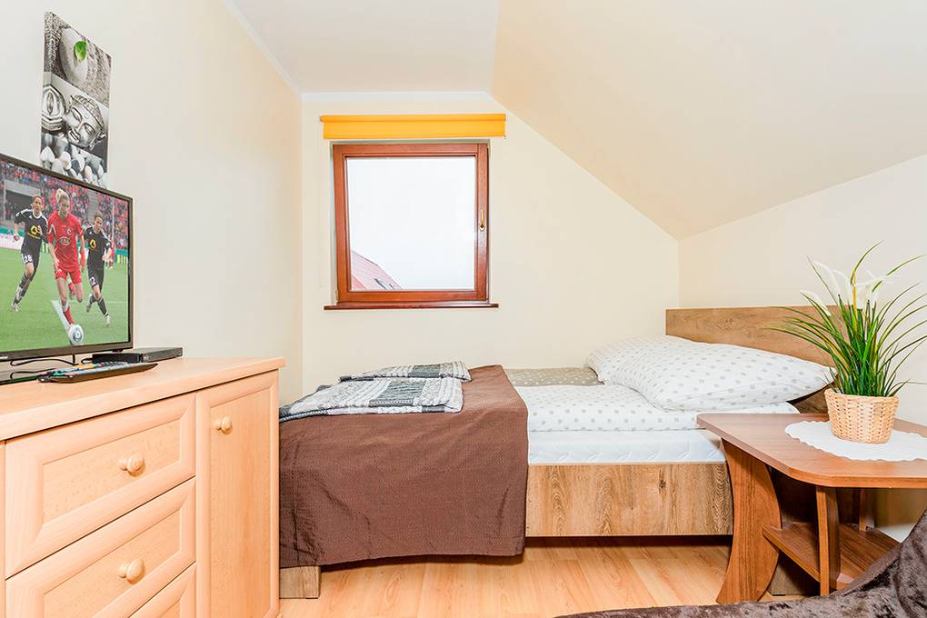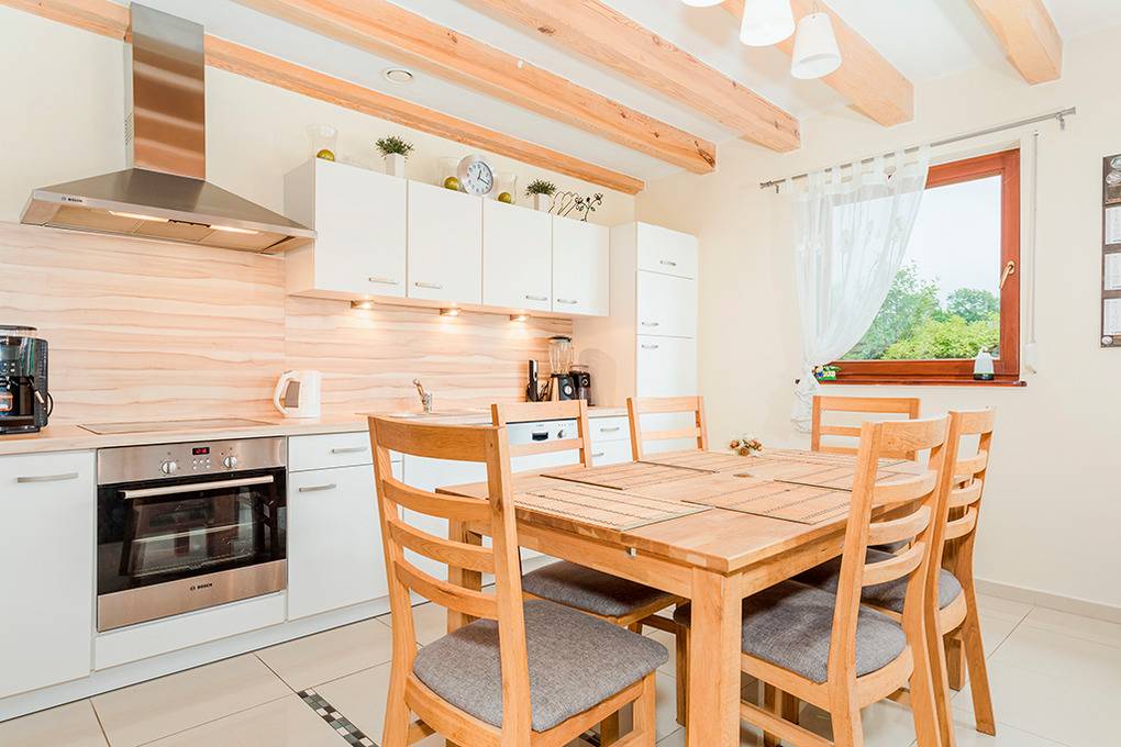 PL 55.27 Ferienhaus 3-8 Pers.: Niveauvolles 4-Zimmerhaus mit 90 qm Wohnfläche über 2 Etagen. Parterre: Großzügiger Wohn-/Essraum mit Kamin, Sitzgarnitur, Flachbild Sat-TV (deutsche Programme), Esstisch, gut ausgestattetem Küchenbereich (E-Herd 4-Pl., Abzugshaube, Backofen, Spülmaschine). Infrarotsauna. Bad: Bw, Wb, WC. Waschmaschine/Trockner. 1. Etage: 2 Doppelzimmer mit Flachbild Sat-TV. 4-Bettzimmer mit Sat-TV, 2 franz. Betten (jeweils 120 cm Breite). Bad: Du, Wb, WC.
