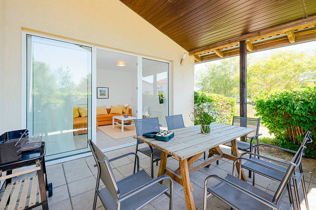 Haus: Kleine Ferienhausanlage mit 10 schönen Häusern auf weitläufigem Rasengrundstück. In der Anlage: Gemeinschaftshaus mit Rezeption, Fitnessraum, Billardtisch, Tischfußball. Spielplatz. Beachvolleyballplatz.