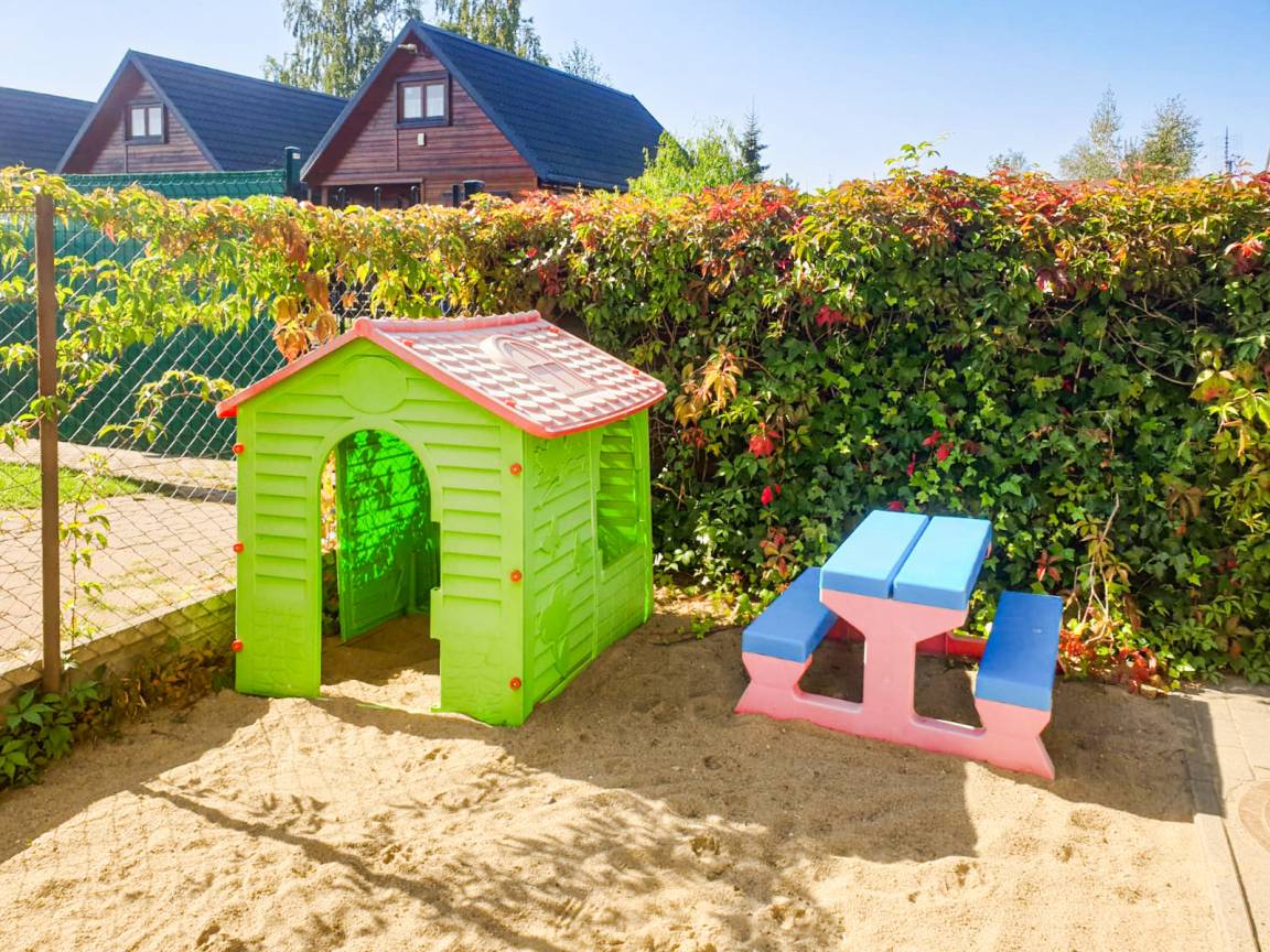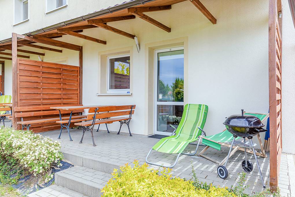 Haus: Freundliche Reihenhäuser mit wohnlicher Einrichtung. Jedes Haus mit 2 Schlafzimmern. 2 Häuser mit Kaminofen (PL 055.014 und PL 055.014A). Wohnliche Einrichtung. Warmwasser über 60 l E-Boiler. Nichtraucherhaus. Kleine Terrasse mit Sitzmöbeln, Grill. Kinderspielplatz zur gemeinschaftlichen Nutzung. 1 Parkplatz pro Ferienhaus auf dem umzäunten Grundstück.