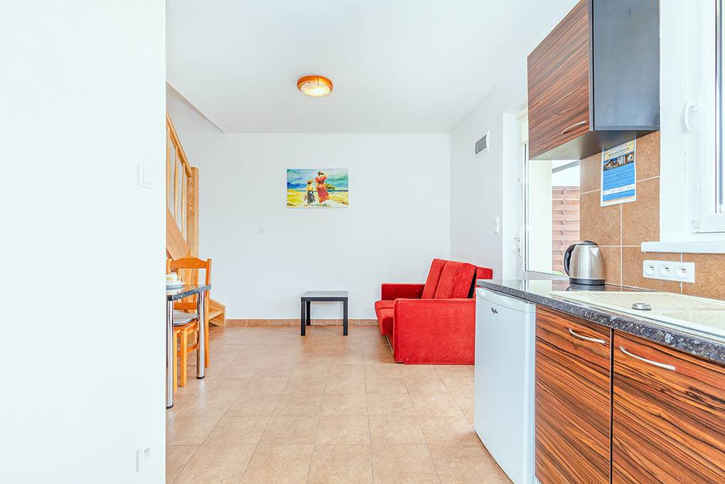 PL 55.14 Ferienhaus 2-4 Pers.: 3-Zimmer-Reihenhaus mit ca. 40 qm Wohnfläche über 2 Etagen. Parterre: Wohn-/Essraum mit Kaminofen (nur in PL 55.14/14A), Sofa, Flachbild Sat-TV, Esstisch, Küchenzeile (2 Platten-Ceranfeld). Bad/WC. 1. Etage: Doppelzimmer. 2-Bettzimmer. Terrasse mit Sitzmöbeln, Grill.