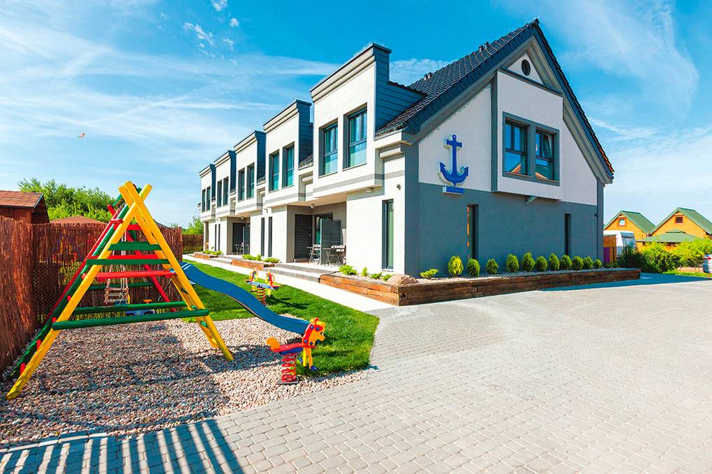 Haus: Schöne Reihenhäuser. Freundliche, wohnliche Einrichtung. Kostenloses Internet (WiFi). Zentralheizung. Terrasse mit Sitzmöbeln. Kleiner Spielplatz mit Schaukel, Rutsche, Trampoline zur gemeinschaftlichen Nutzung. 1 Pkw-Stellplatz/Haus auf dem umzäunten Grundstück.