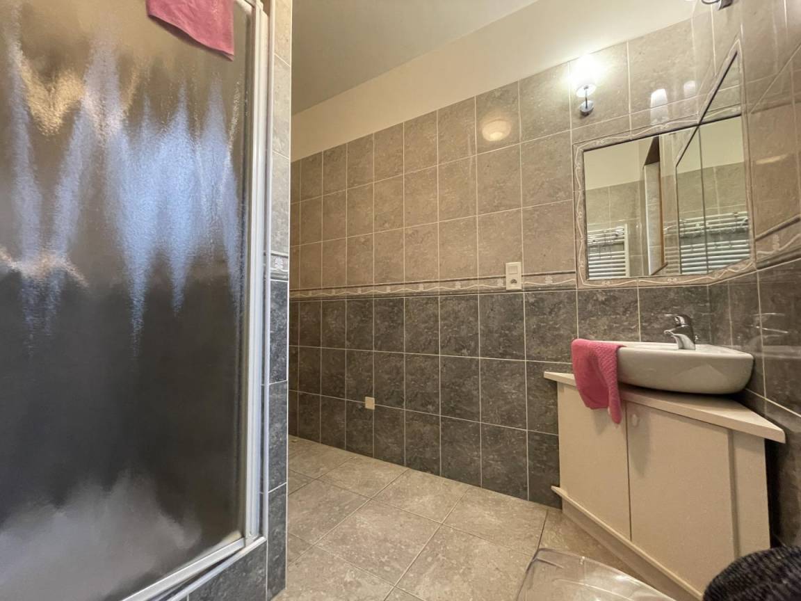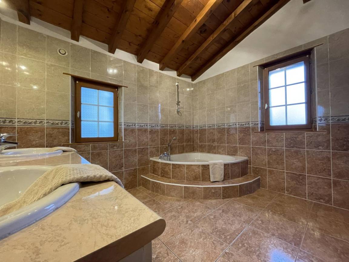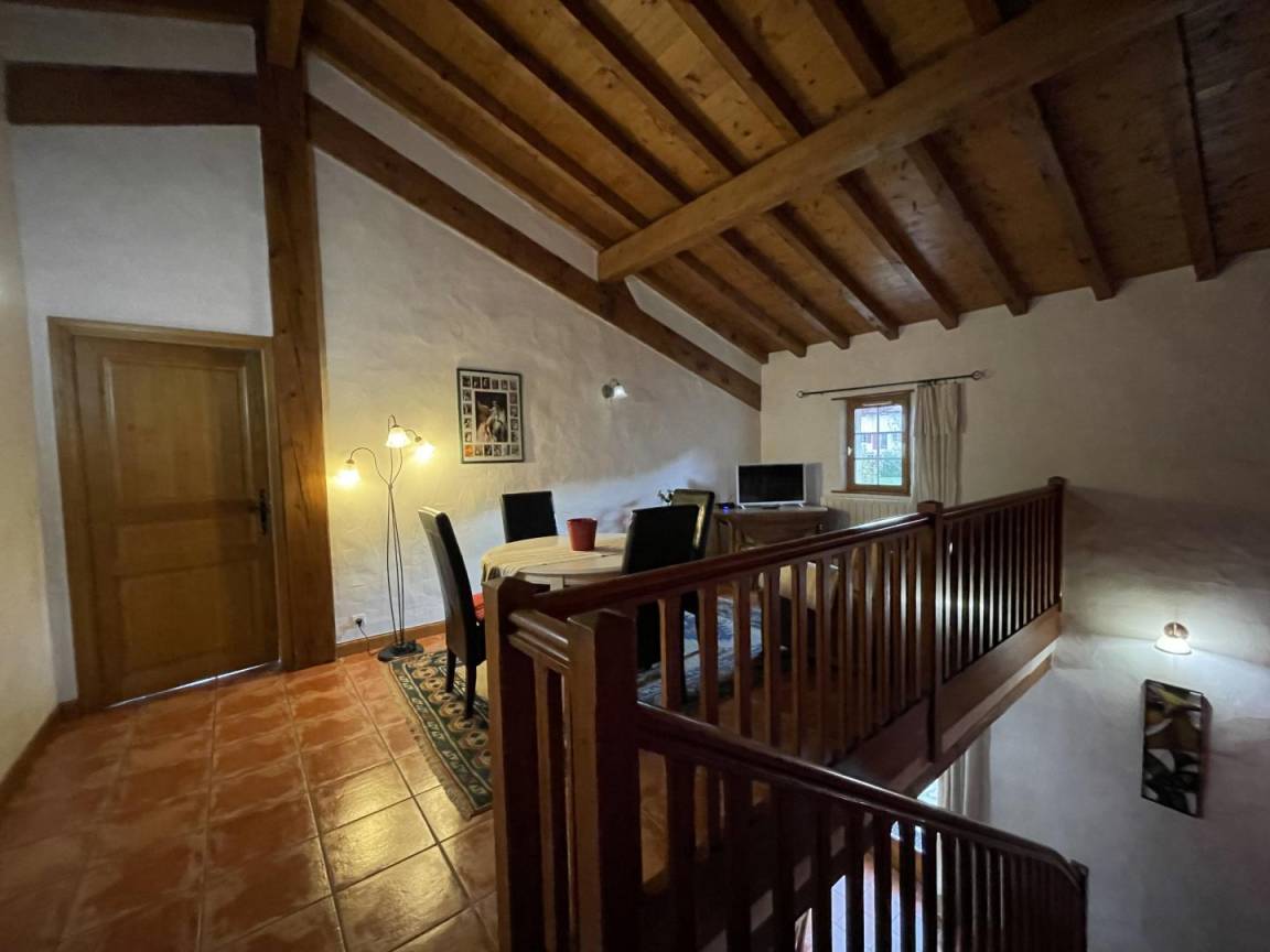 Obergeschoss: Entspannungslandung (Sessel), 1 Schlafzimmer (1 Doppelbett) mit eigenem Bad, 2 Schlafzimmer (1 Doppelbett, 2 Einzelbetten, 1 Kinderbett), Badezimmer (Badewanne, Dusche), WC.