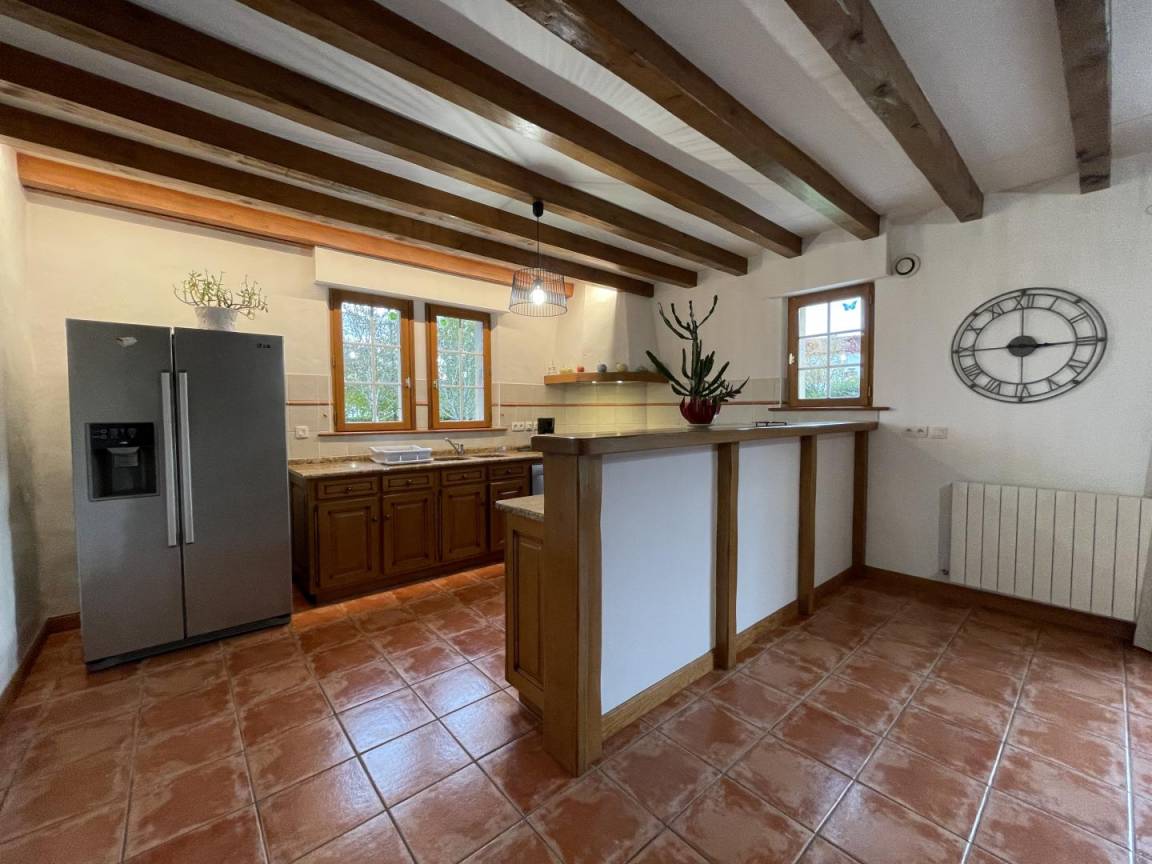 Erdgeschoss: Einbauküche (Mikrowelle, amerikanischer Kühlschrank, Induktionskochfeld), Wohnzimmer, Wohnzimmer (Kamin), 1 Schlafzimmer (1 Doppelbett), Duschbad, WC, Speisekammer (Wäschetrockner).
