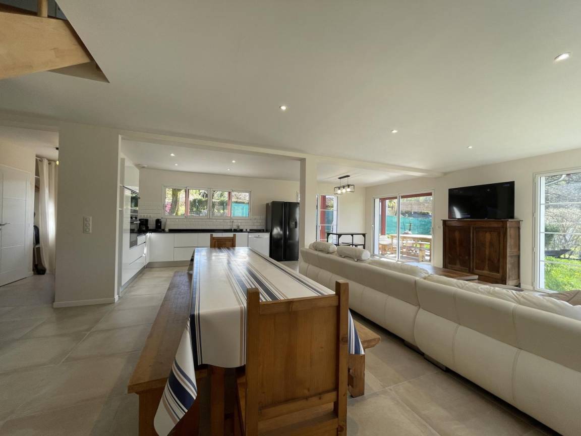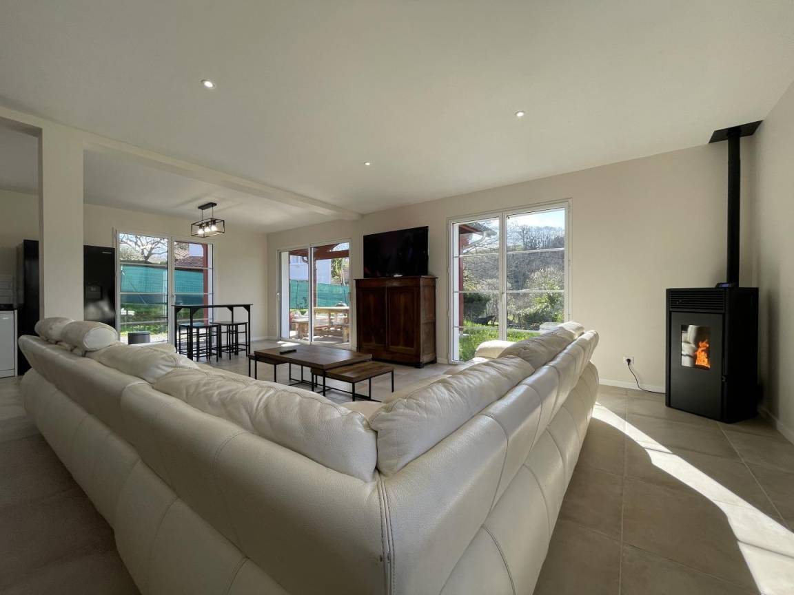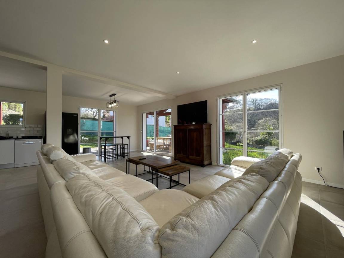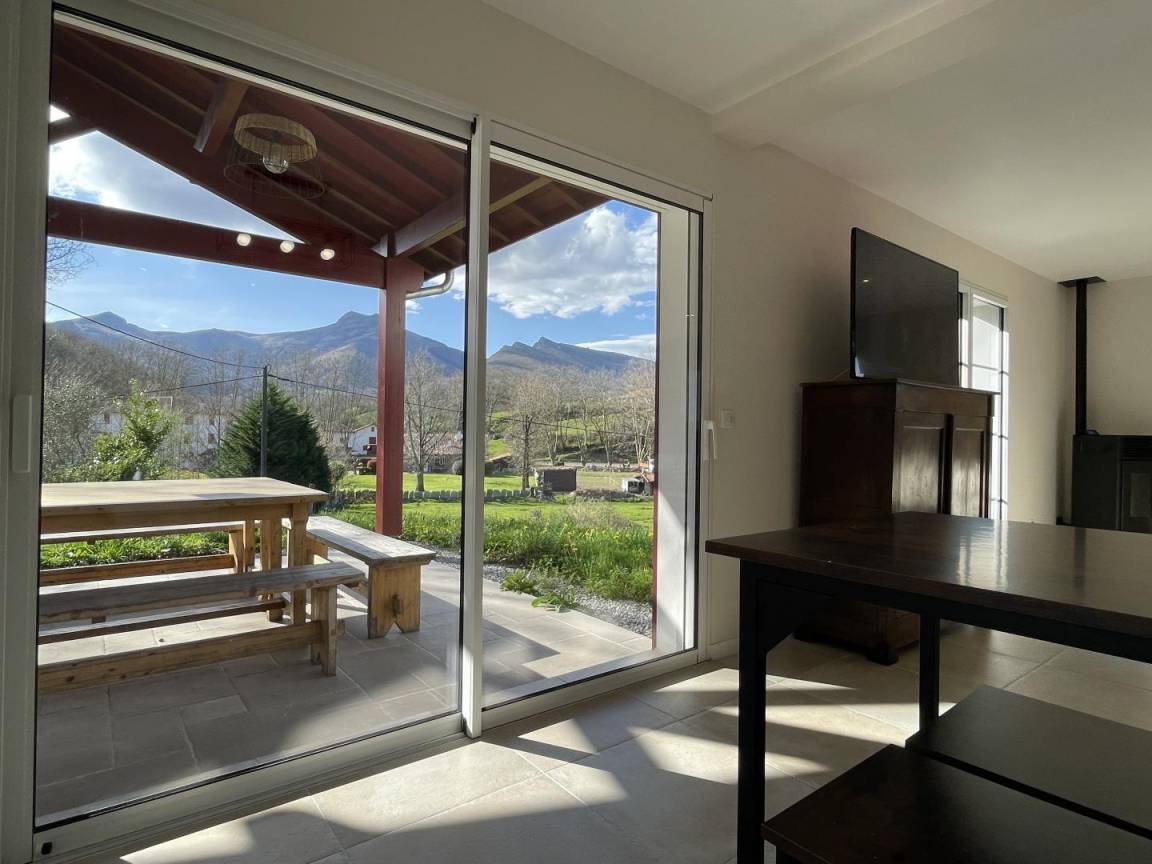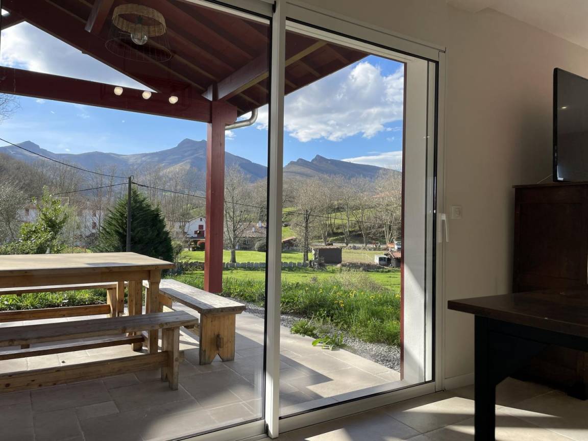Das Wohnzimmer öffnet sich zu einer überdachten Terrasse mit Gartenmöbeln, von der aus Sie die Aussicht auf die Rhune und das Dorf genießen können.