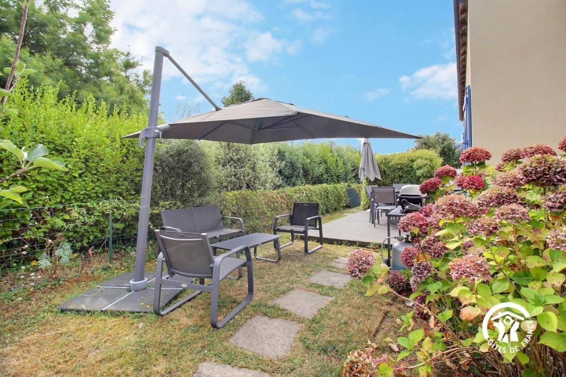 Garten mit Terrasse, Esstisch, Gartenmöbeln, Sonnenschirm, Gasgrill und Liegestühlen.