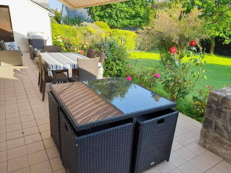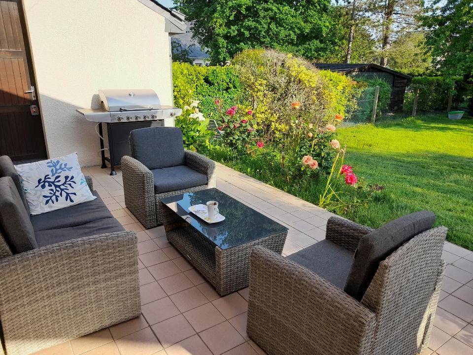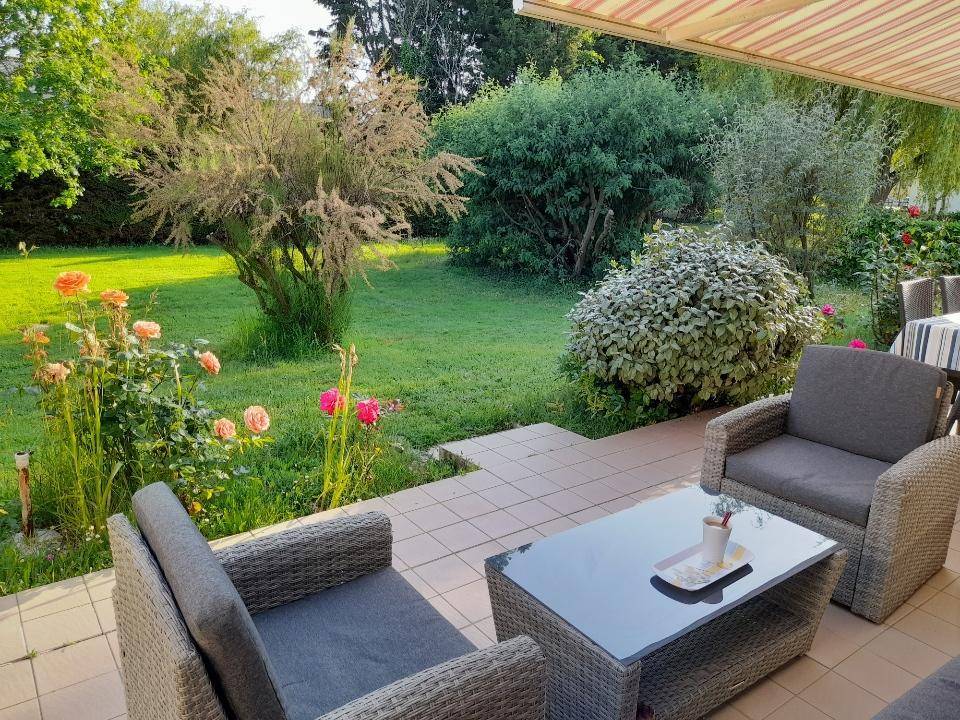 Umzäunter Garten, Südterrasse mit Markise, Esstisch, Gartenmöbeln, Grill und Liegestühlen.