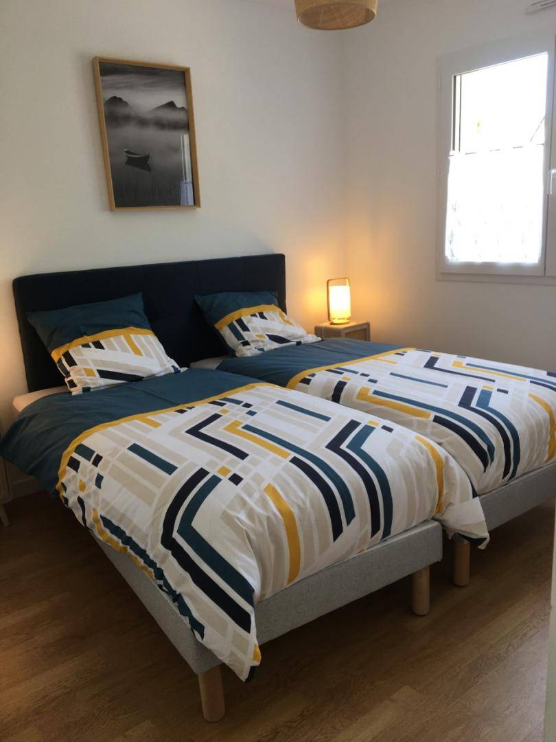 Das Cottage ist ein modernes Haus auf einer Ebene. Es liegt in einer ruhigen Sackgasse und profitiert von einem eingezäunten Grundstück von 360 m² für die Sicherheit von Kindern. Es bietet Ihnen: einen Eingang, ein sehr helles Wohnzimmer mit Einbauküche, Wohnzimmer und Aufenthaltsraum, ein Schlafzimmer mit einem 160x200-Bett und das andere Schlafzimmer mit 2 90x190-Betten, ein Duschbad und ein separates WC. Draußen: ein 70 m² großer Garten, eine große ausgestattete Holzterrasse, ein geschlossener Unterstand für Fahrräder, ein Gemüsegarten in der Saison und eine geschotterte Auffahrt zum Parken von bis zu 2 Autos.