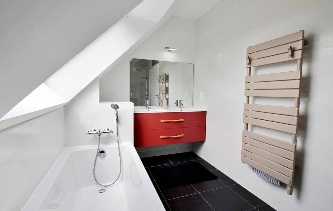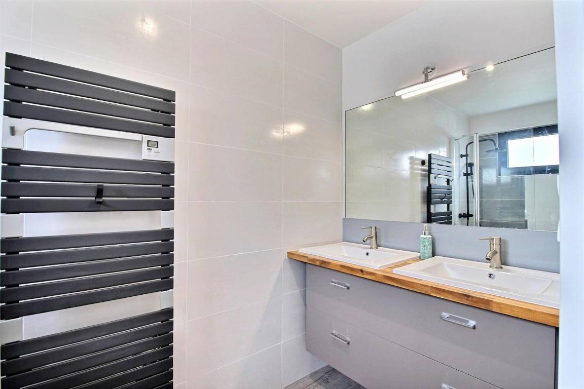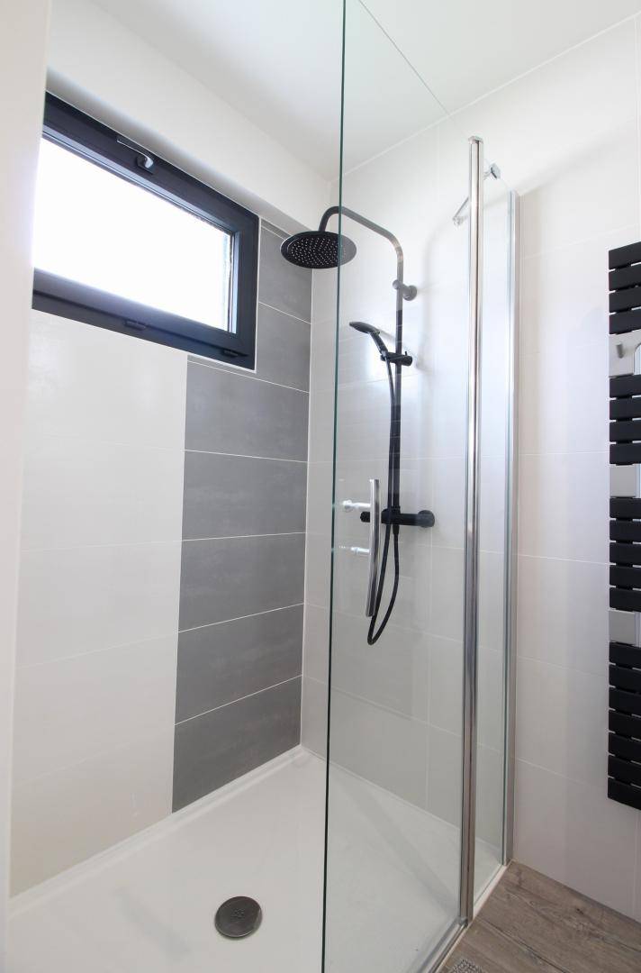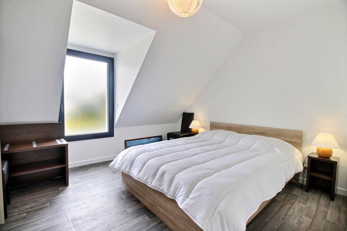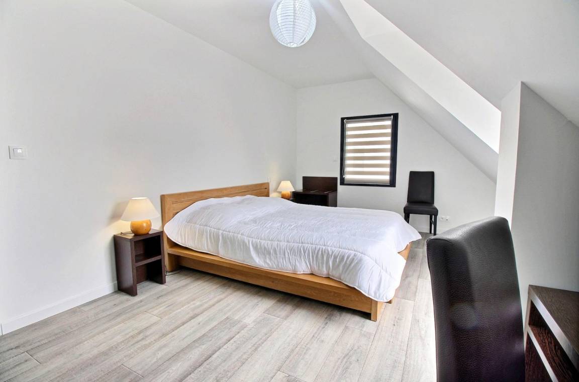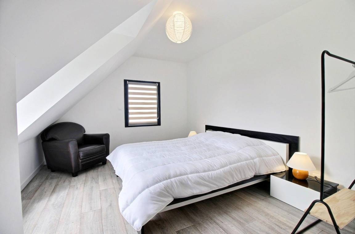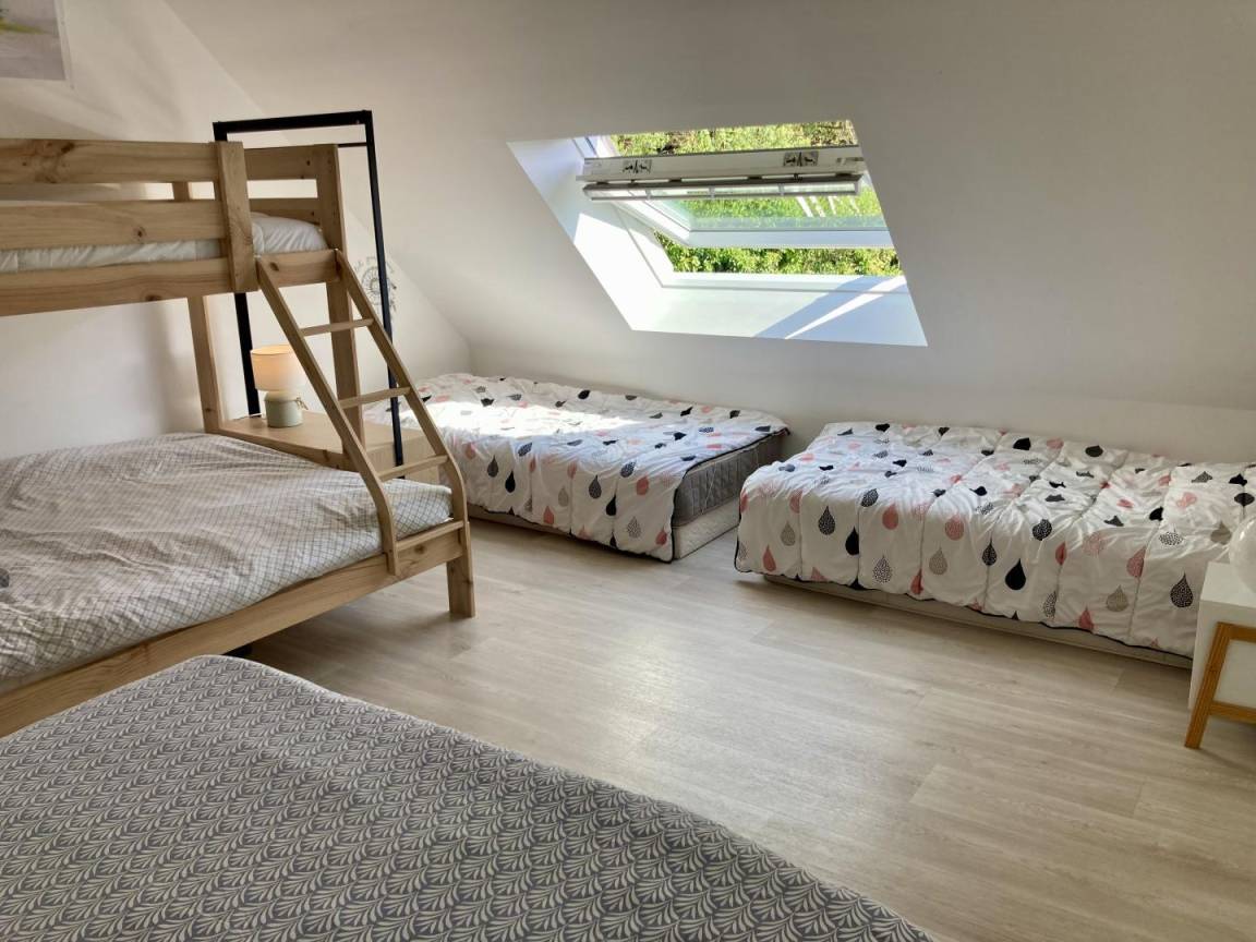 Im Obergeschoss: 3 Doppelzimmer (jeweils mit 160-cm-Bett) und ein Schlafsaal (3 90-cm-Betten, darunter 1 Etagenbett und 1 160-cm-Bett). Außerdem auf dieser Ebene: ein Badezimmer (Badewanne und Dusche) und eine separate Toilette.