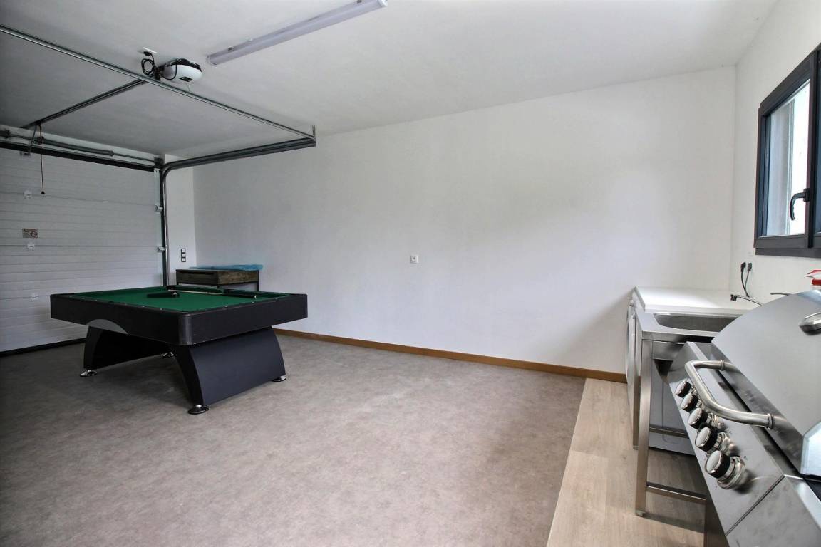 Das Haus bietet Ihnen im Erdgeschoss: ein helles Wohnzimmer mit voll ausgestatteter Küche inklusive Essbereich, ein Wohnzimmer, ein Schlafzimmer (1 160 cm Bett) mit eigenem Bad und eine separate Toilette. Außerdem steht Ihnen eine Garage zur Verfügung, die in eine Waschküche umgewandelt und mit einem Billardtisch ausgestattet ist.