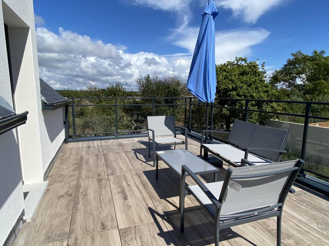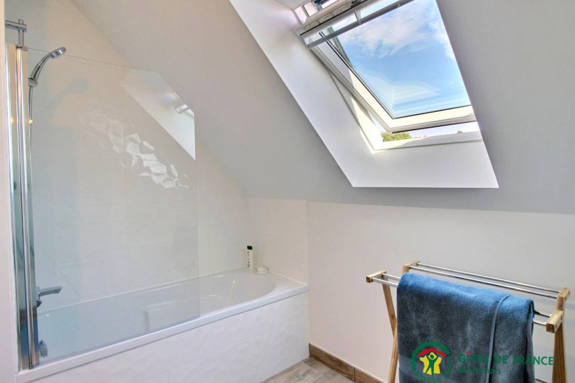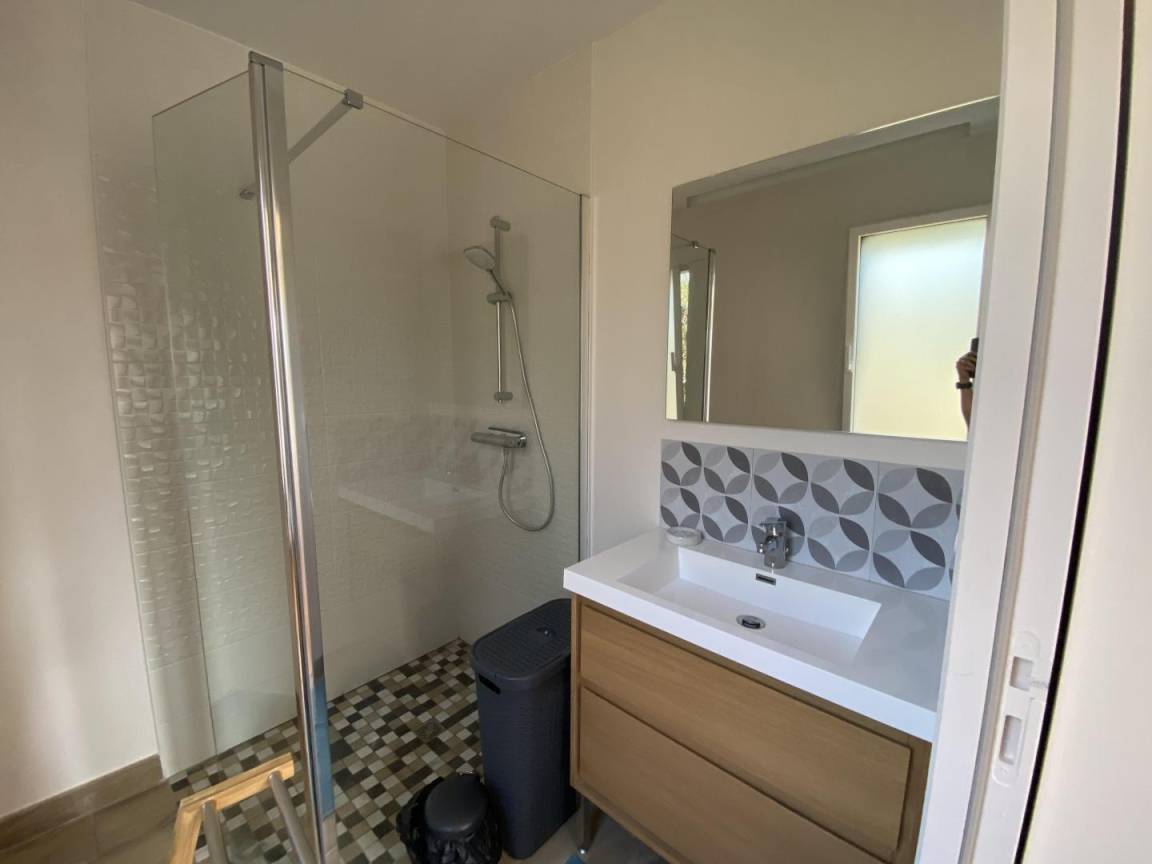 - ein Schlafzimmer mit zwei Einzelbetten (90 x 190 cm), die zu einem Doppelbett zusammengestellt werden können, Zugang zu einer 15 m² großen, möblierten Terrasse, und ein Badezimmer (Badewanne und Dusche)