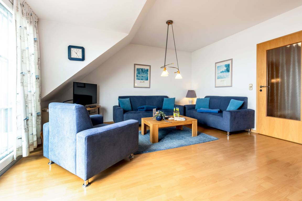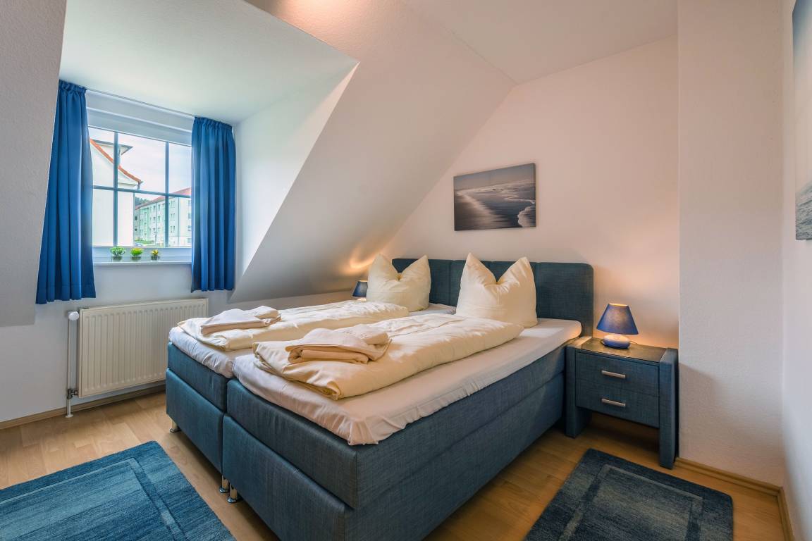 Die 60 m ² große und mit 4 DTV Sternen klassifizierte Ferienwohnung 3 befindet sich auf der rechten Seite im Obergeschoss im Ferienhaus Trelleborg. Sie bietet mit ihren drei Zimmern ausreichend Platz für bis zu 5 Personen.