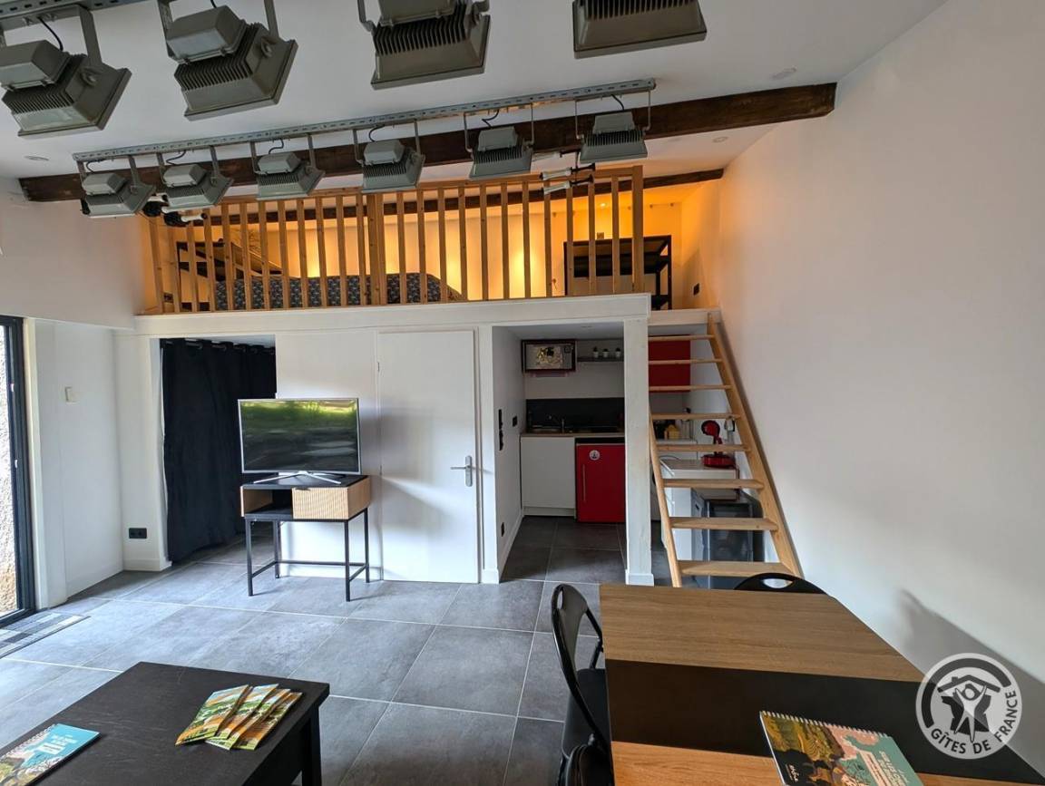 „Implantation pratique dans ce secteur du Nord de Lyon. Logement indépendant, autonome et calme. Mezzanine un peu basse donc moyennement accessible.“