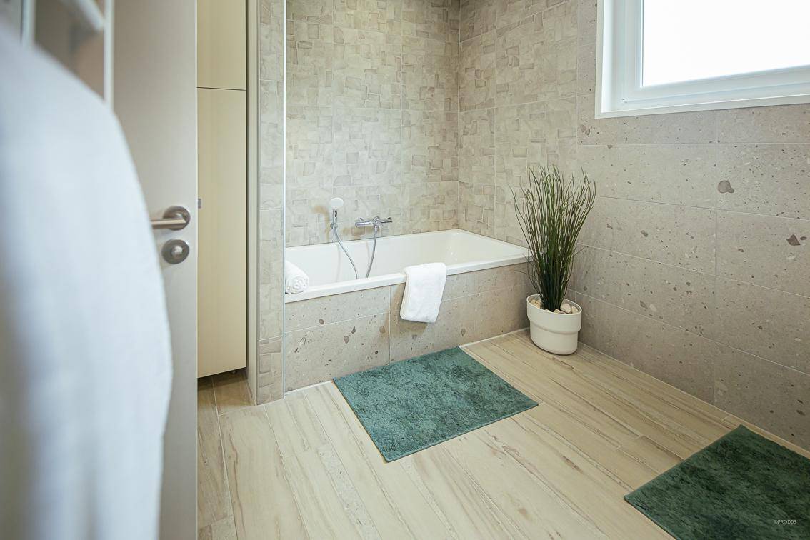 Erdgeschoss: zum Wohnzimmer offene Küche, Badezimmer mit ebenerdiger Dusche und Badewanne, separates WC, 3 Schlafzimmer für 2 Personen.