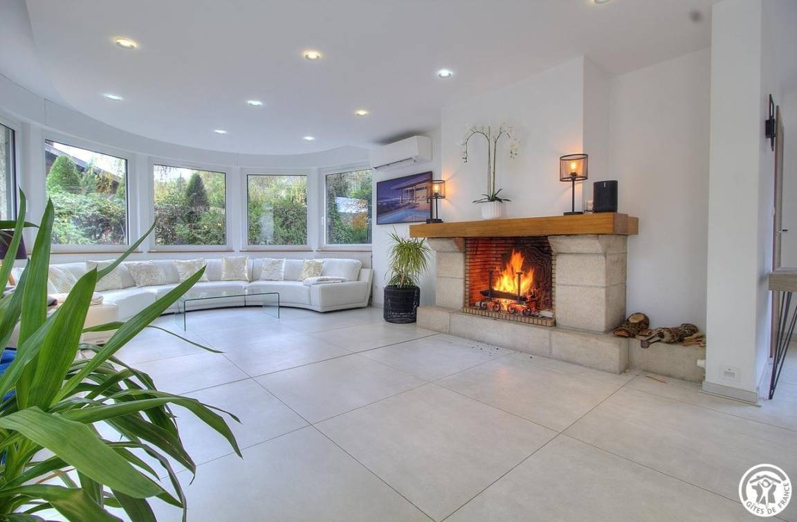 Ichen Fenster tauchen den Raum in ein sanftes, gleichmäßiges Licht und verleihen ihm eine ruhige und einladende Atmosphäre. Jeder Bereich ist darauf ausgelegt, Ruhe und Entspannung zu bieten: ein geräumiges Wohnzimmer mit Kamin, eine einladende offene Küche und mehrere gemütliche Nischen, in denen man mit einem Buch entspannen, mit der Familie spielen oder einfach die Schönheit der Umgebung genießen kann.