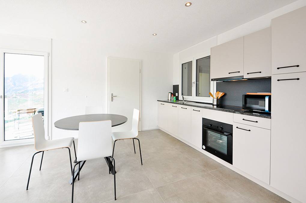 CH 369.51 Wohnung 2-3 Pers.: 2-Zimmerwohnung mit 45 qm Wohnfläche, Parterre. Wohn-/Essraum mit Panorama-Fenstern, Sitzgruppe (Schlafsofa 135*190), TV, Esstisch, gut ausgestatteter Einbauküche (Backofen, Spülmaschine), Balkon. Doppelzimmer. Bad: Du, Wb, WC.