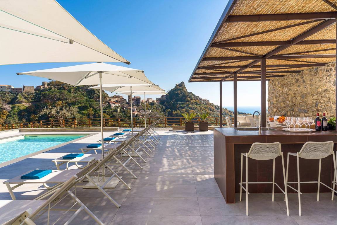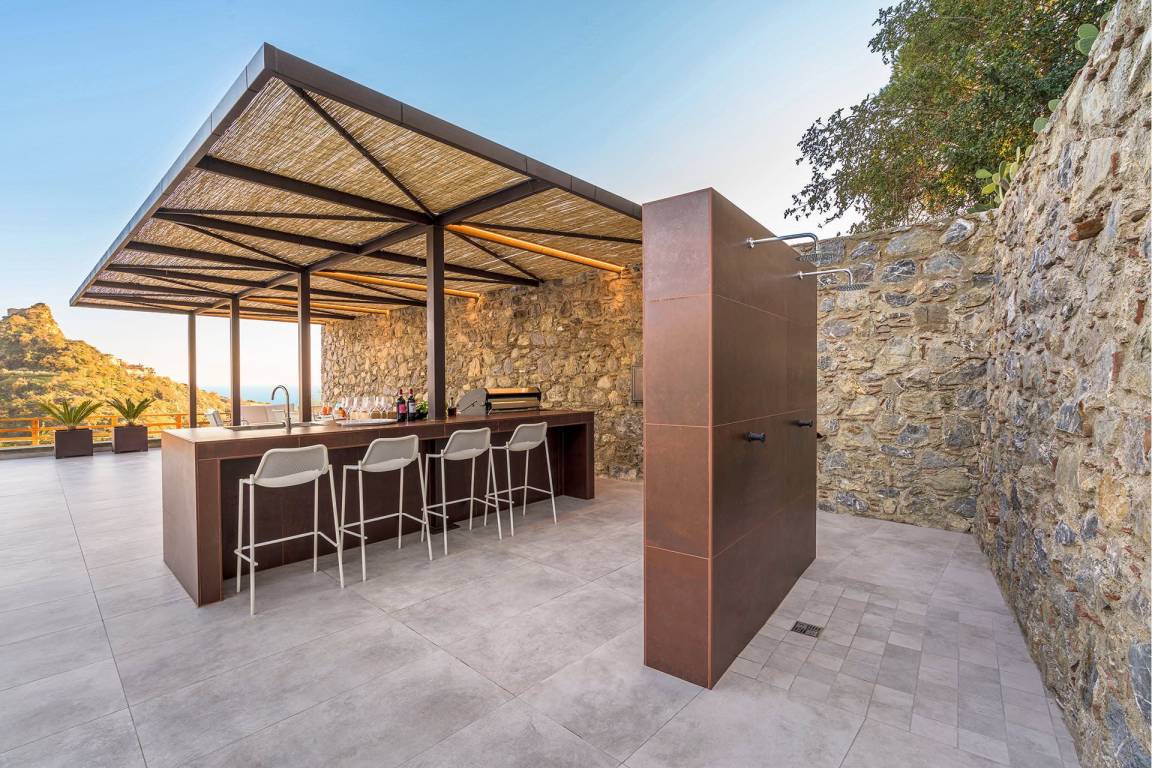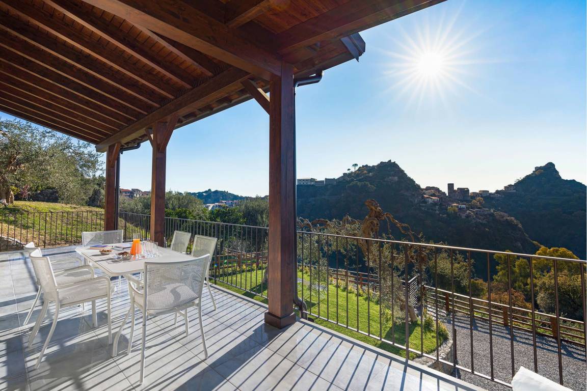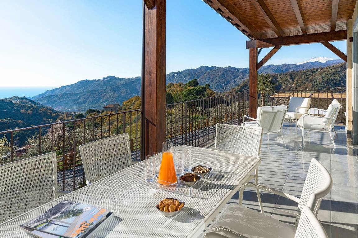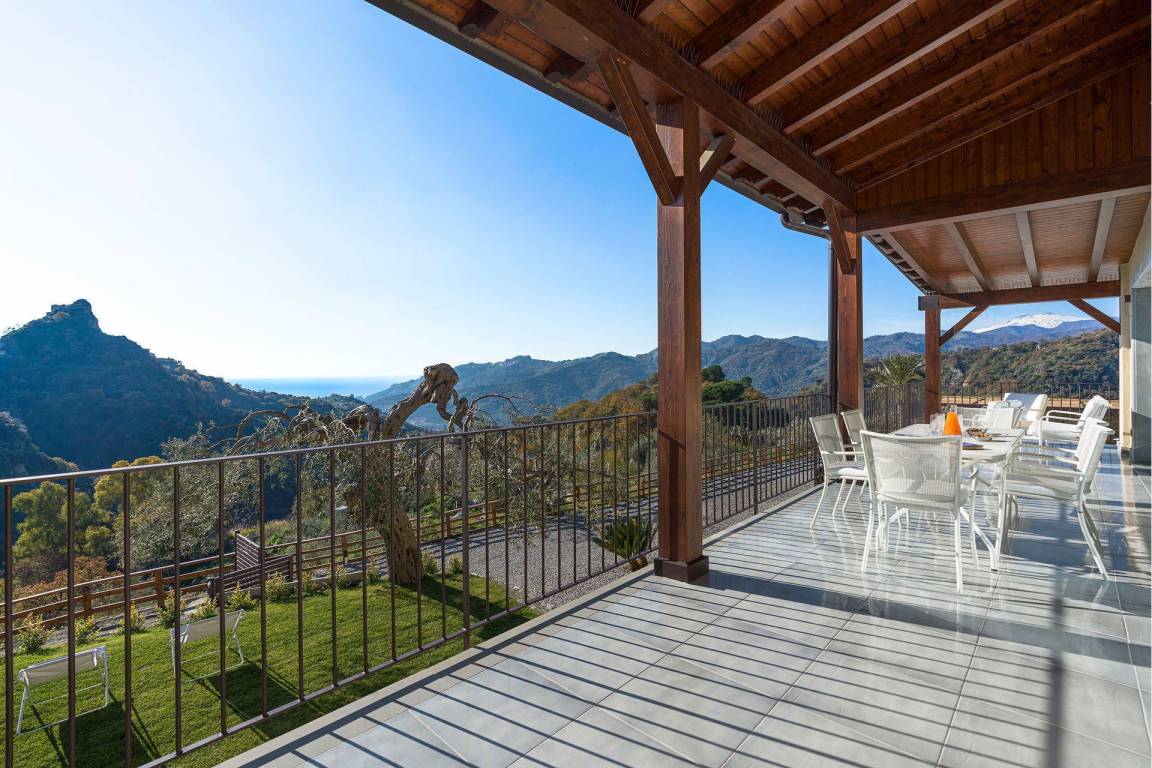 Die Villa liegt an einem Hang nördlich von Taormina und bietet Panoramablicke auf die umliegenden Täler. Das Grundstück umfasst einen privaten Garten und großzügig ausgestattete Terrassen, die sich für Außenessen und Entspannung eignen.
